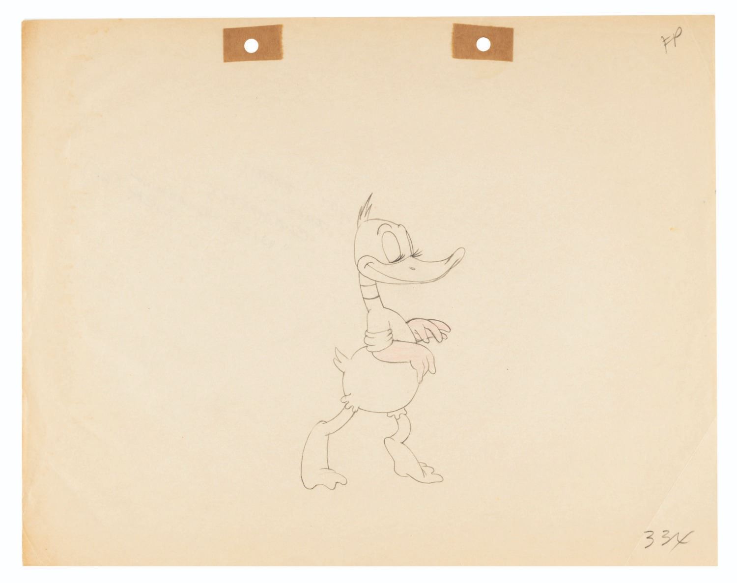 (Schlesinger, 1943) An original production drawing of Daffy Duck from “The Wise Quacking Duck,” directed by Bob Clampett. A note on the back identifies the artist as Art Babbitt. With an image size of 5” x 2.75” on 9.5” x 12” animation paper, the drawing is in very good condition, with discoloration from age, and handling wear mainly to the edges.