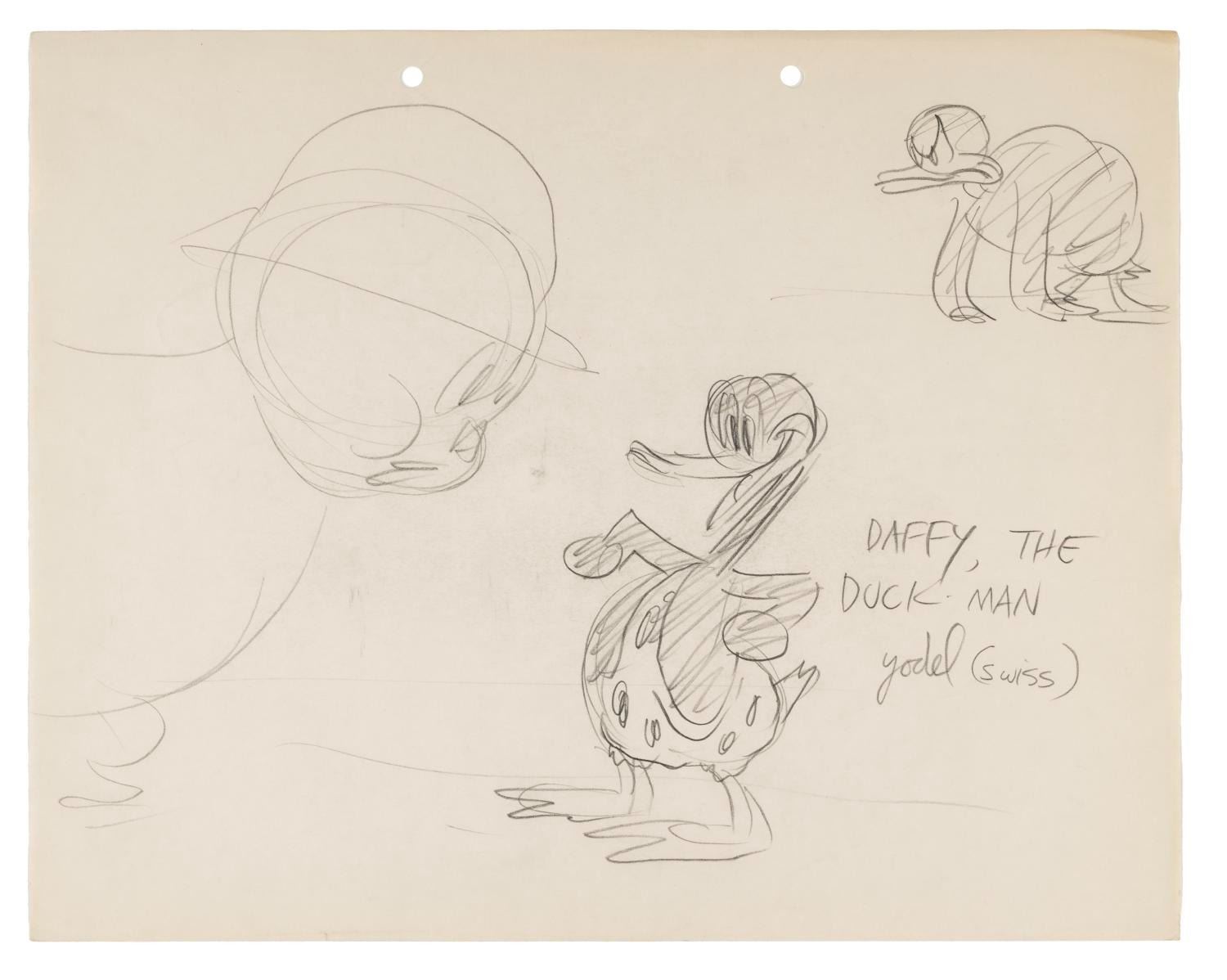 (Warner Bros., 1930s-40s) An original concept drawing for an unproduced gag featuring Porky Pig in a pith helmet and Daffy Duck dressed Tarzan-style as “Daffy, the Duck Man.” Measuring 8.25” x 12” on 9.5” x 12” animation paper, the graphite drawing is in very good condition with light creases.
