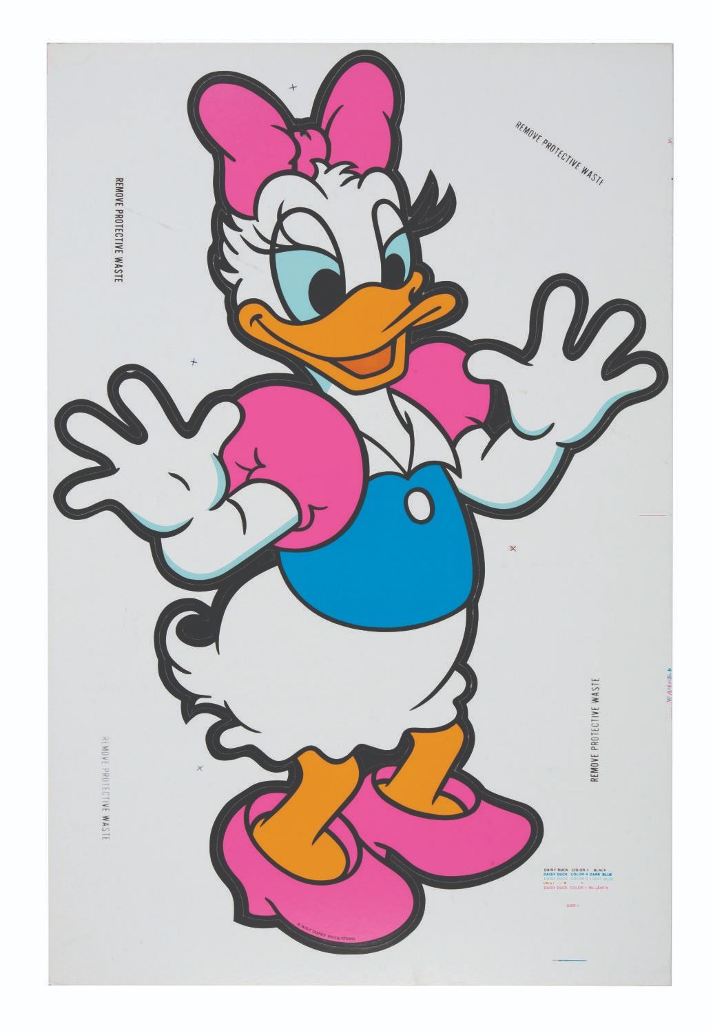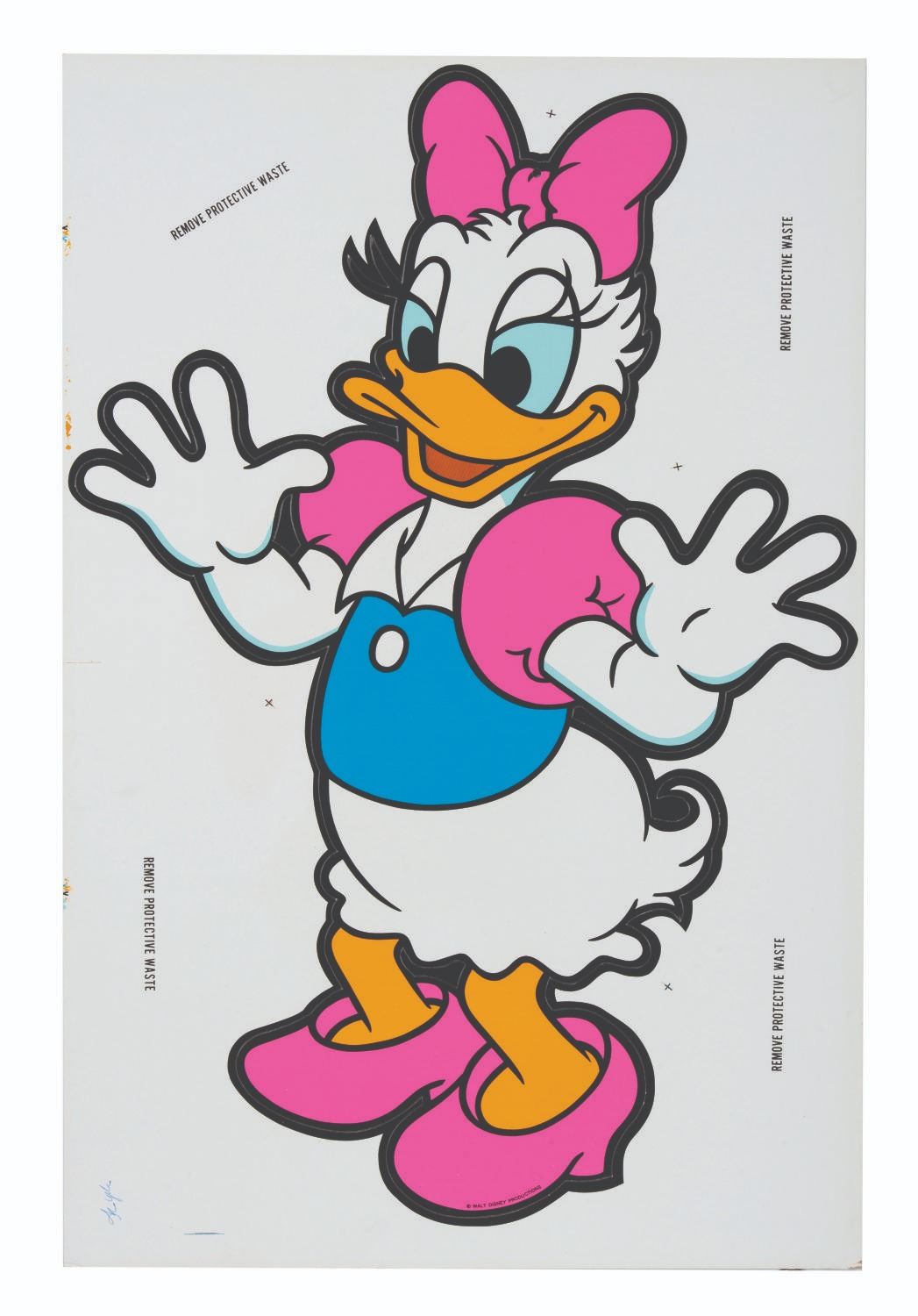 (Disney, 1960s-70s) A hanging Daisy Duck display created by the Walt Disney Productions Character Merchandise Division. The large six-color figure has an image size of 33" x 22.25" on its 35" x 23" cardstock sheet and is in fine as-new condition, exhibiting light wear and slightly coming unpunched from its card.