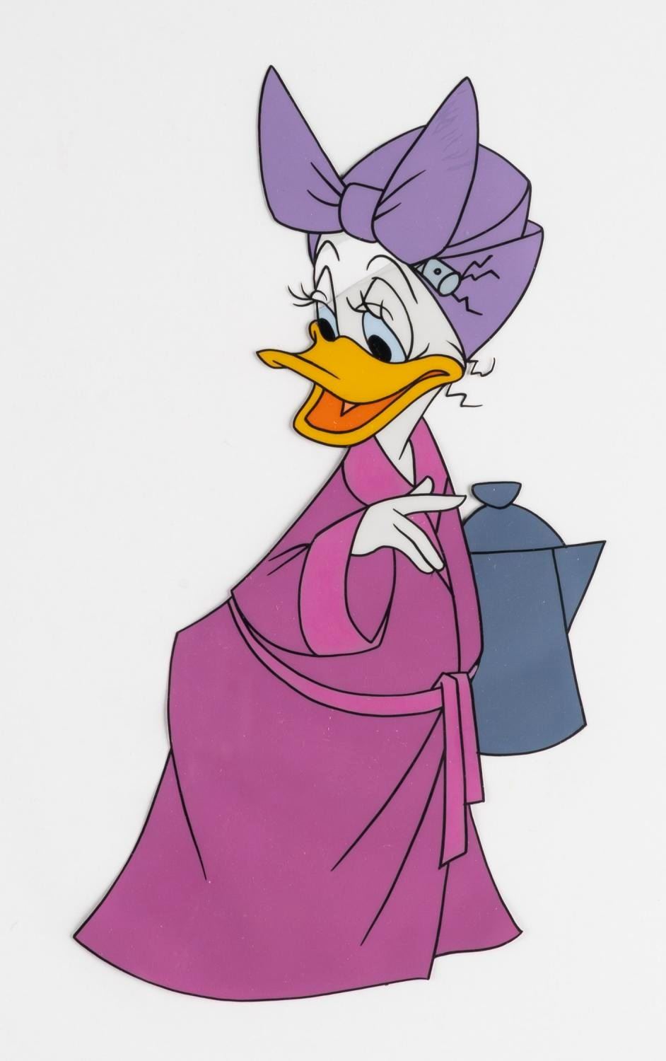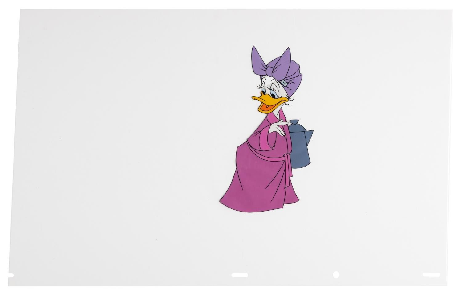 (Disney, 1959) An original hand-painted production cel of Daisy Duck from “How to Have an Accident at Work.” With a character image size of 6” x 0.5”, the cel has been trimmed to 10” x 15.75” and is in good condition with a 0.5” x 0.5” area of paint loss in the upper section of the face.