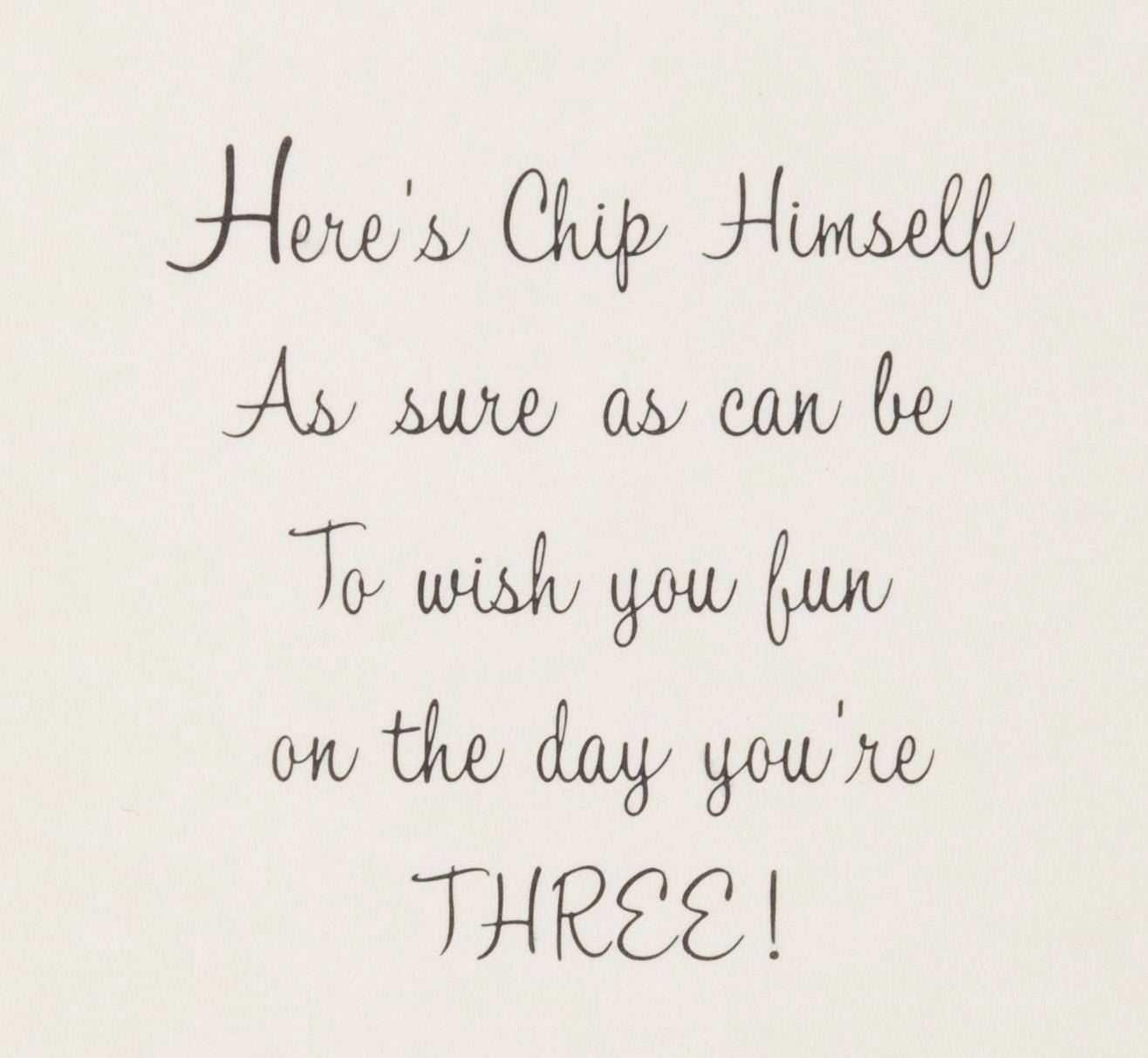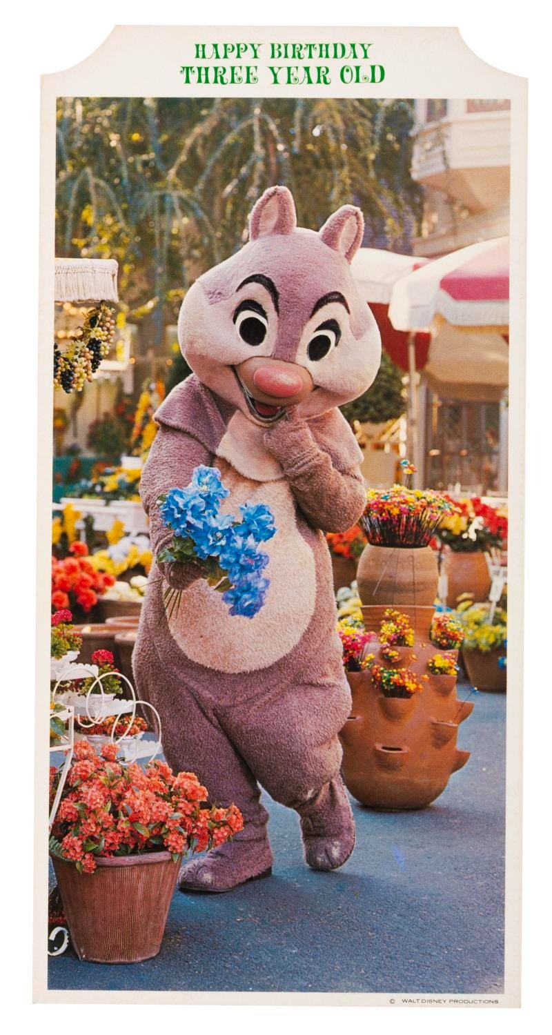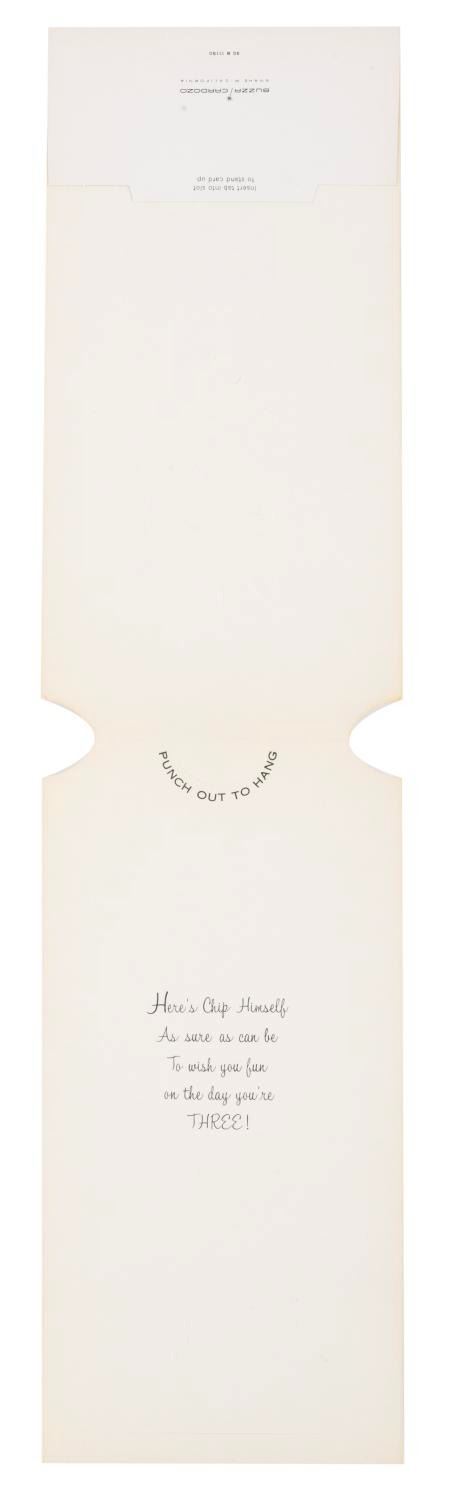 (Buzza Cardozo, 1960s-70s) A Dale stand-up card, intended for a three-year-old. Measuring 5.5" x 11", the embossed card displays in very good condition with scuffs, wear, and discoloration from age.