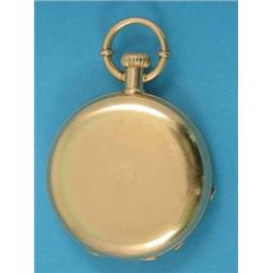 A Danish 18k gold keyless hunter, with engine-turned case and enamelled Roman dial with subsidiary seconds and blued steel moon hands, club tooth lever movement, going barrel with ‘wolf’s tooth’ winding, cut bi-metallic balance, blued steel spiral spring with overcoil and regulation with compensation curb, signed on dial, movement and back plate Jules Jurgensen, Copenhagen, no. 10833, (Patent 1867 January 15) £1,000-1,500
