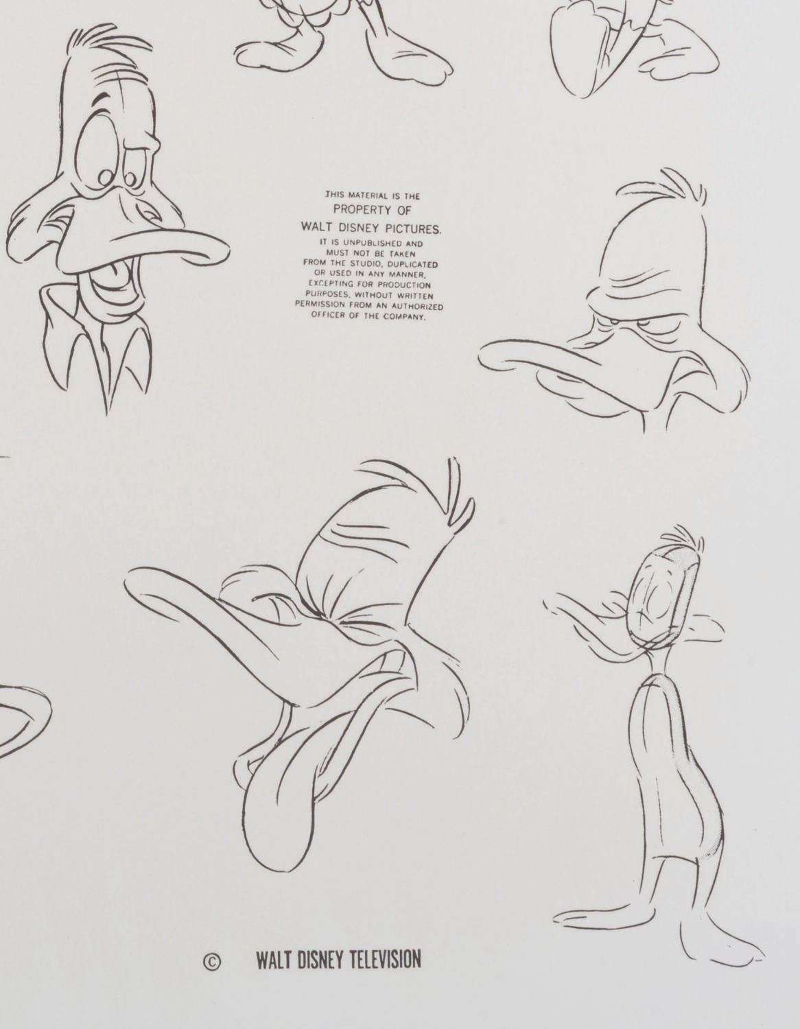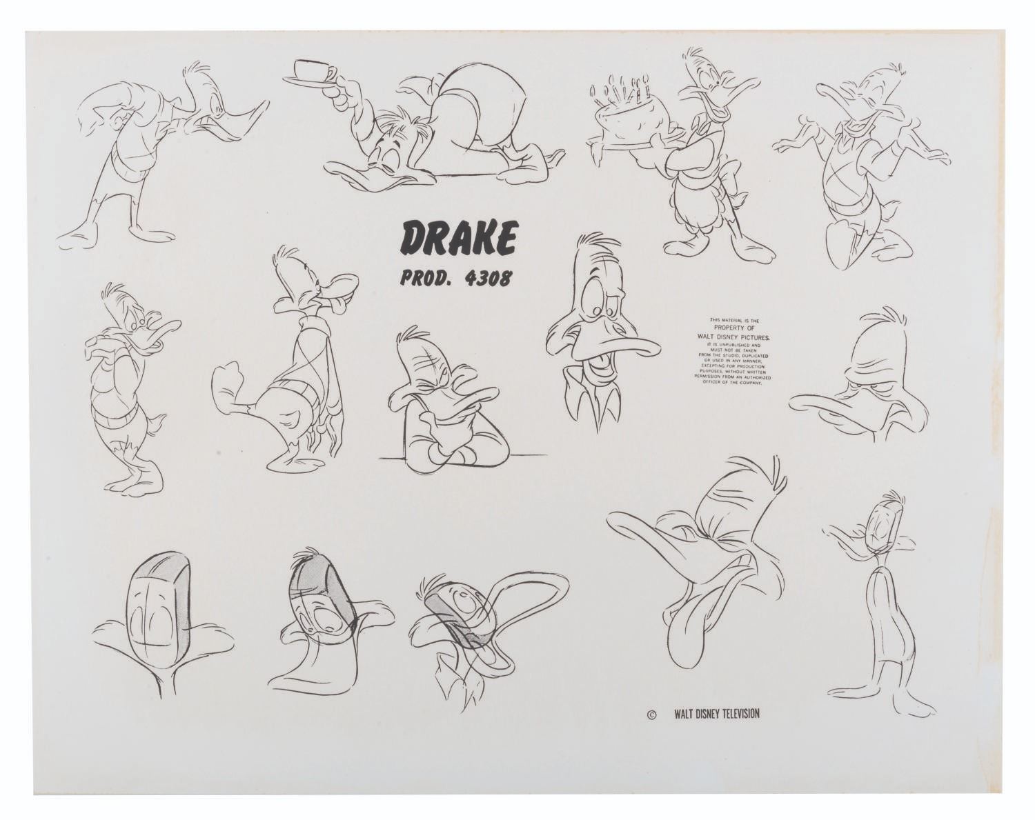 (Disney, 1991) An original Studio printed model sheet of Drake Mallard, the alter ego of Darkwing Duck. Model sheets such as this were distributed to animators and crew working on the series to ensure character design continuity. Measuring 11" x 14", the model sheet is in good condition with discoloration along the edges and reverse.