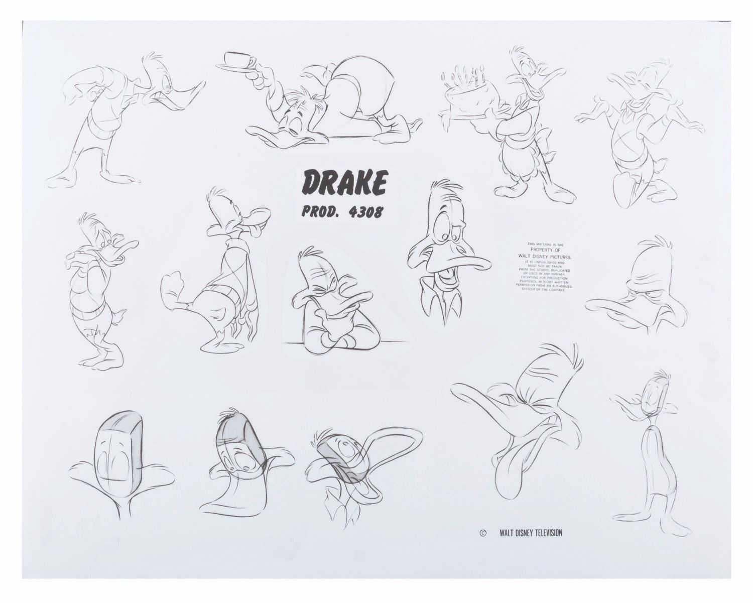 (Disney, 1991) An original Studio printed model sheet of Drake Mallard, the alter ego of Darkwing Duck. Model sheets such as this were distributed to animators and crew working on the series to ensure character design continuity. Measuring 11" x 14", the model sheet is in very good condition with light handling wear.
