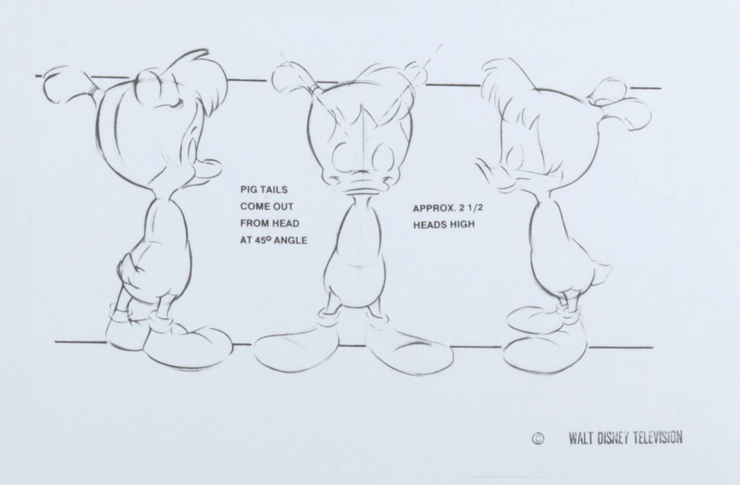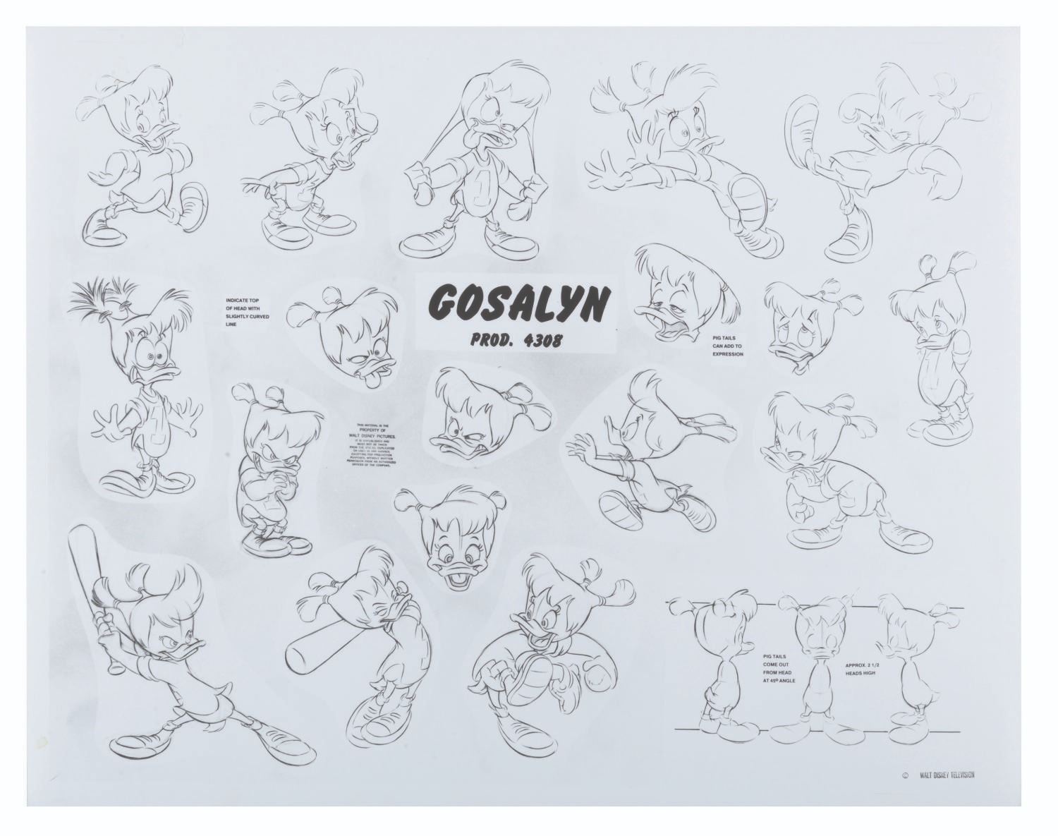 (Disney, 1991) A Studio-produced model sheet of Gosalyn from "Darkwing Duck." Model sheets such as this were distributed to animators and crew working on the show to ensure character design continuity. Measuring 11" x 14", the model sheet displays in very good condition with light stains, an ink mark, and wear.