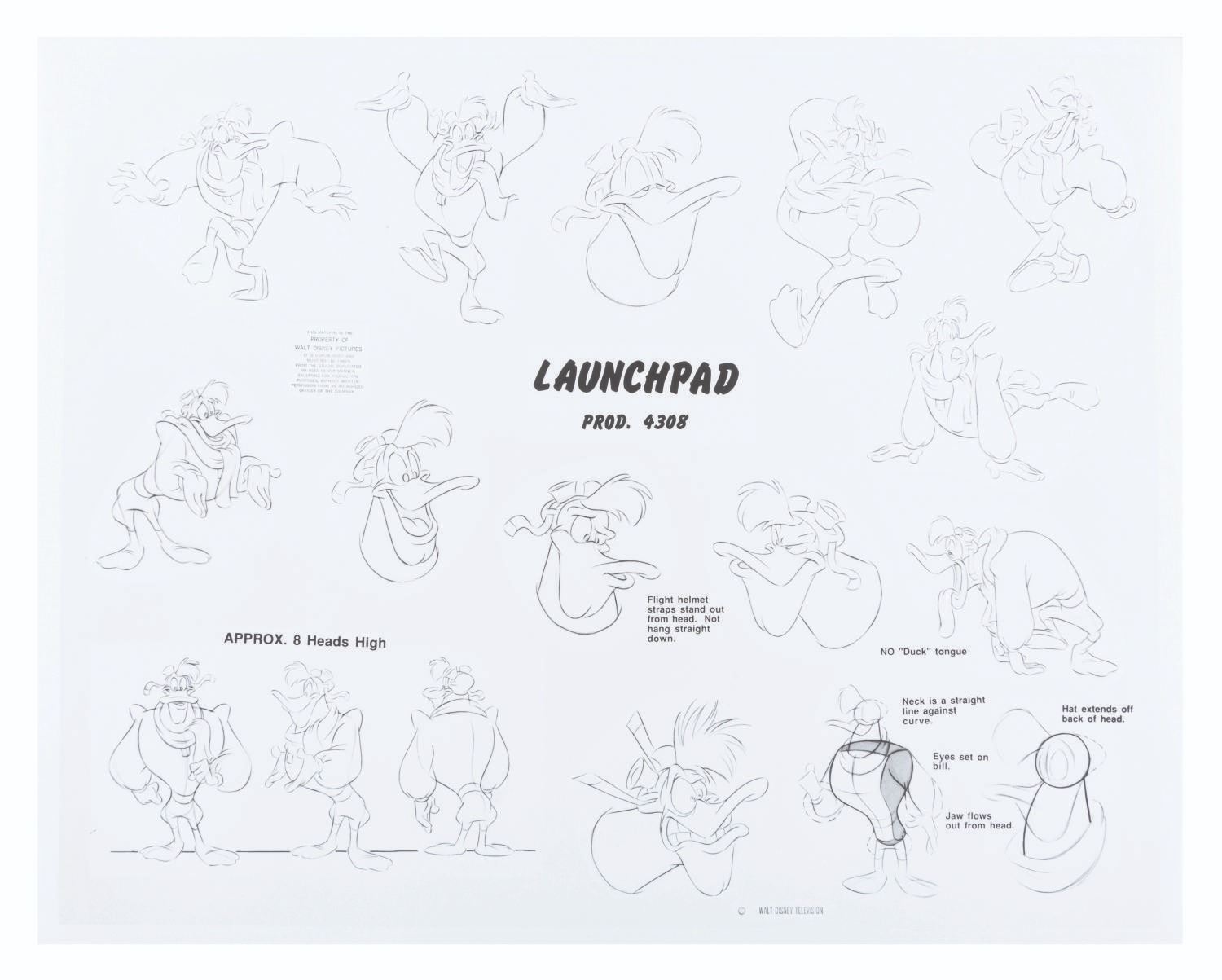 (Disney, 1991) An original Studio printed model sheet of Launchpad McQuack from "Darkwing Duck." Model sheets such as this were distributed to animators and crew working on the series to ensure character design continuity. Measuring 11" x 14", the model sheet is in very good condition with light handling wear.