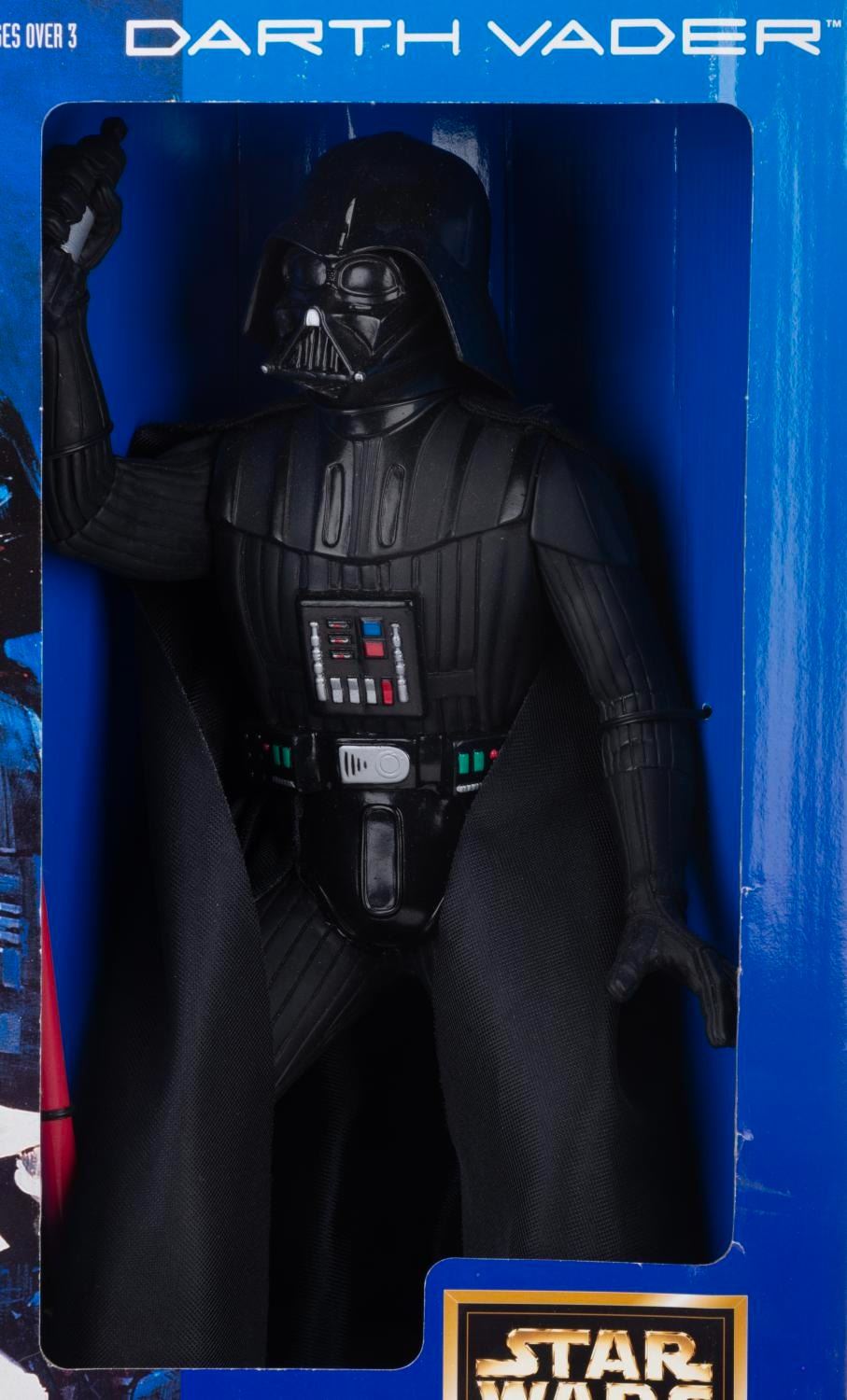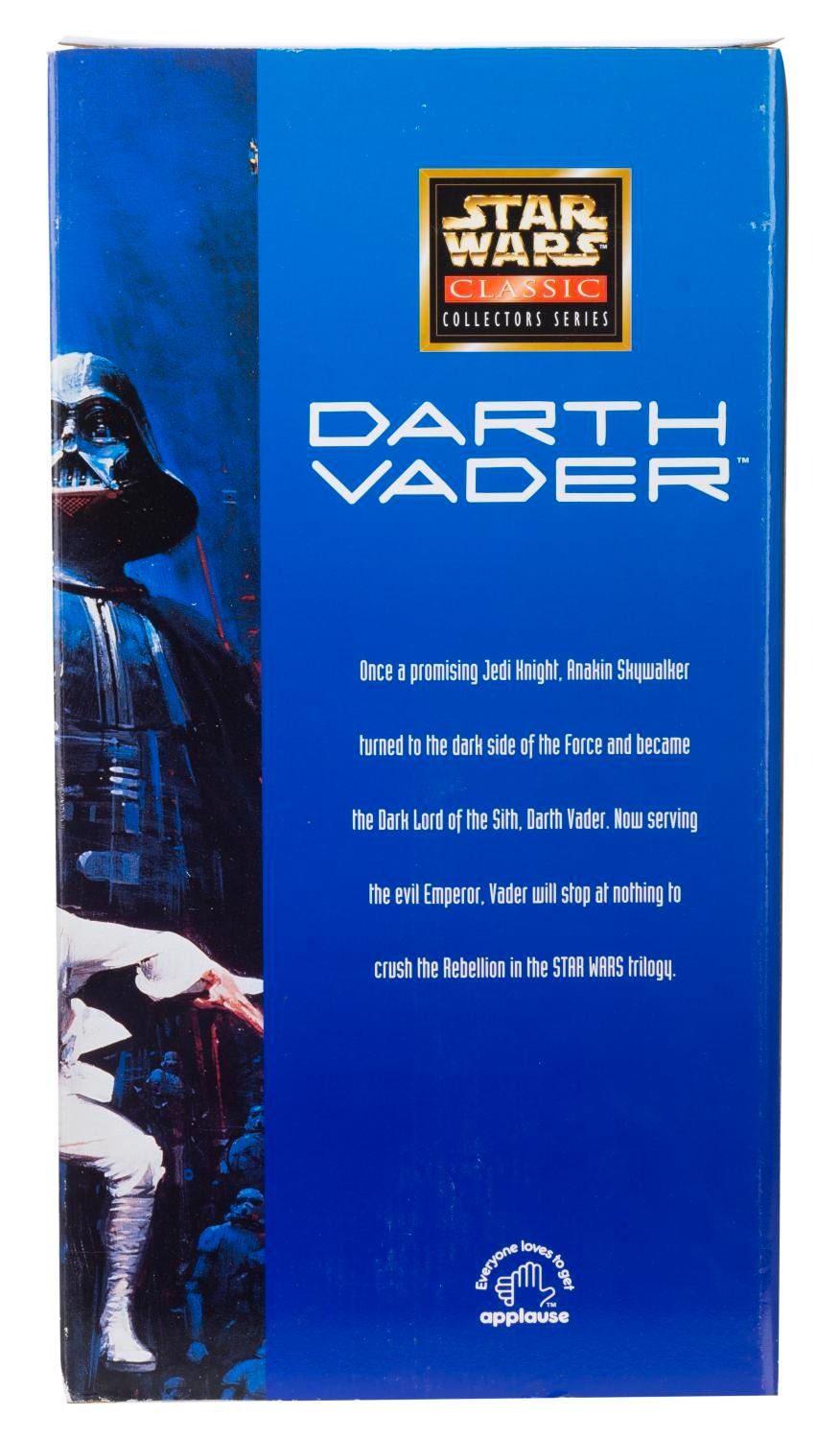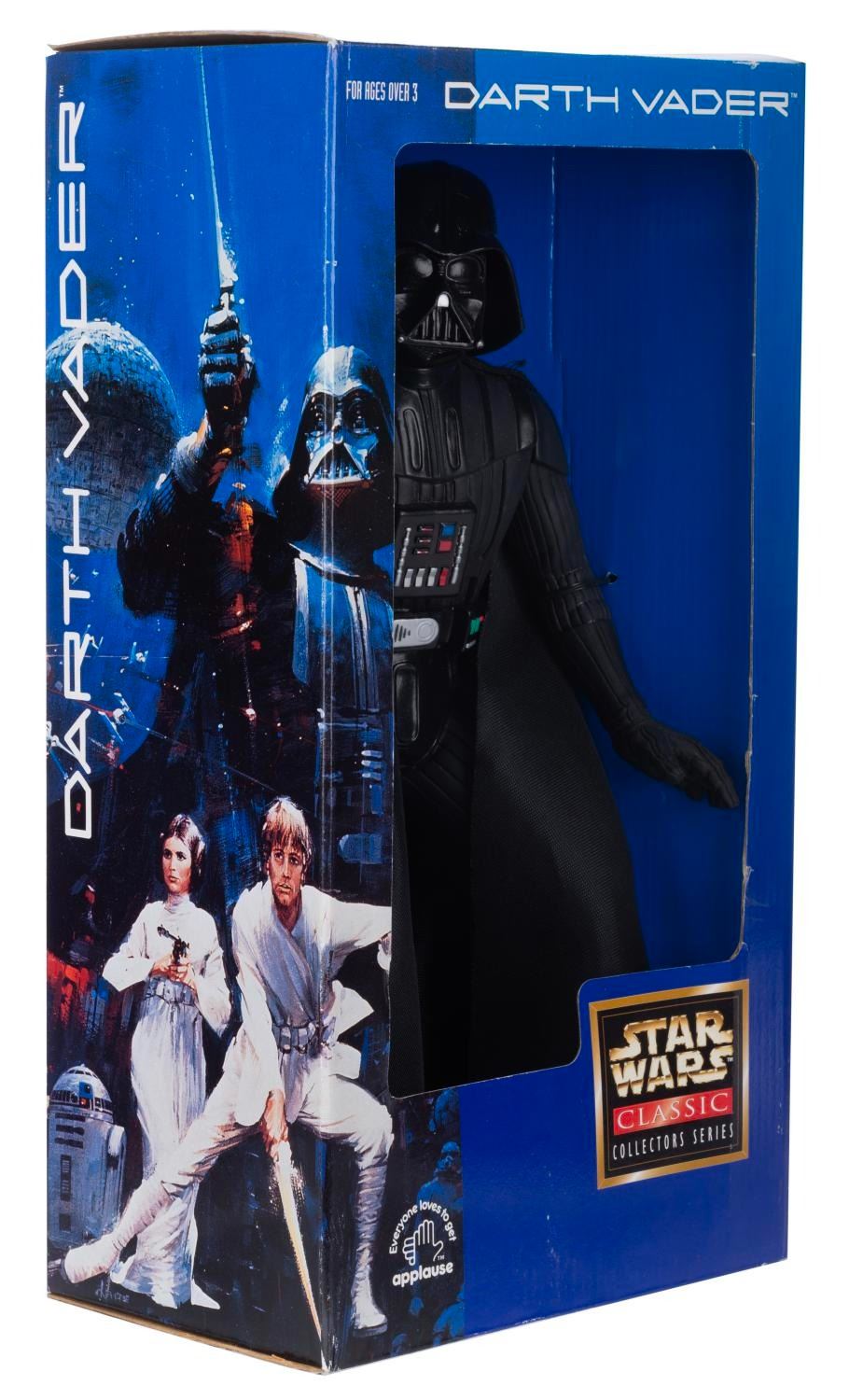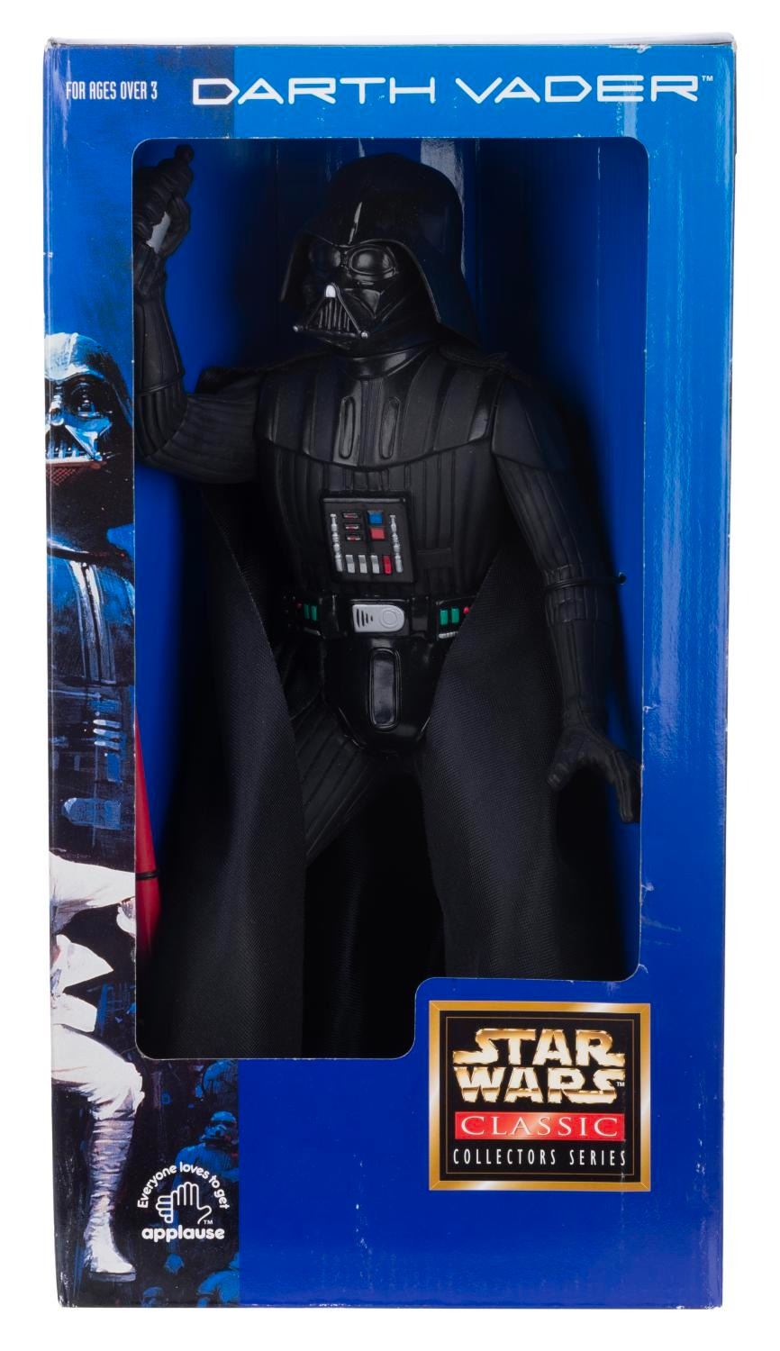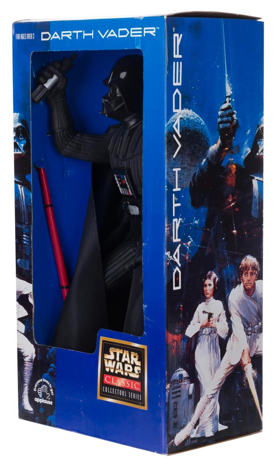 (Applause, 1997) A vinyl figure of Darth Vader, with lightsaber and cloth cape. Standing 13” tall (without the 7” lightsaber attached) the figure is in fine condition still in the original box.