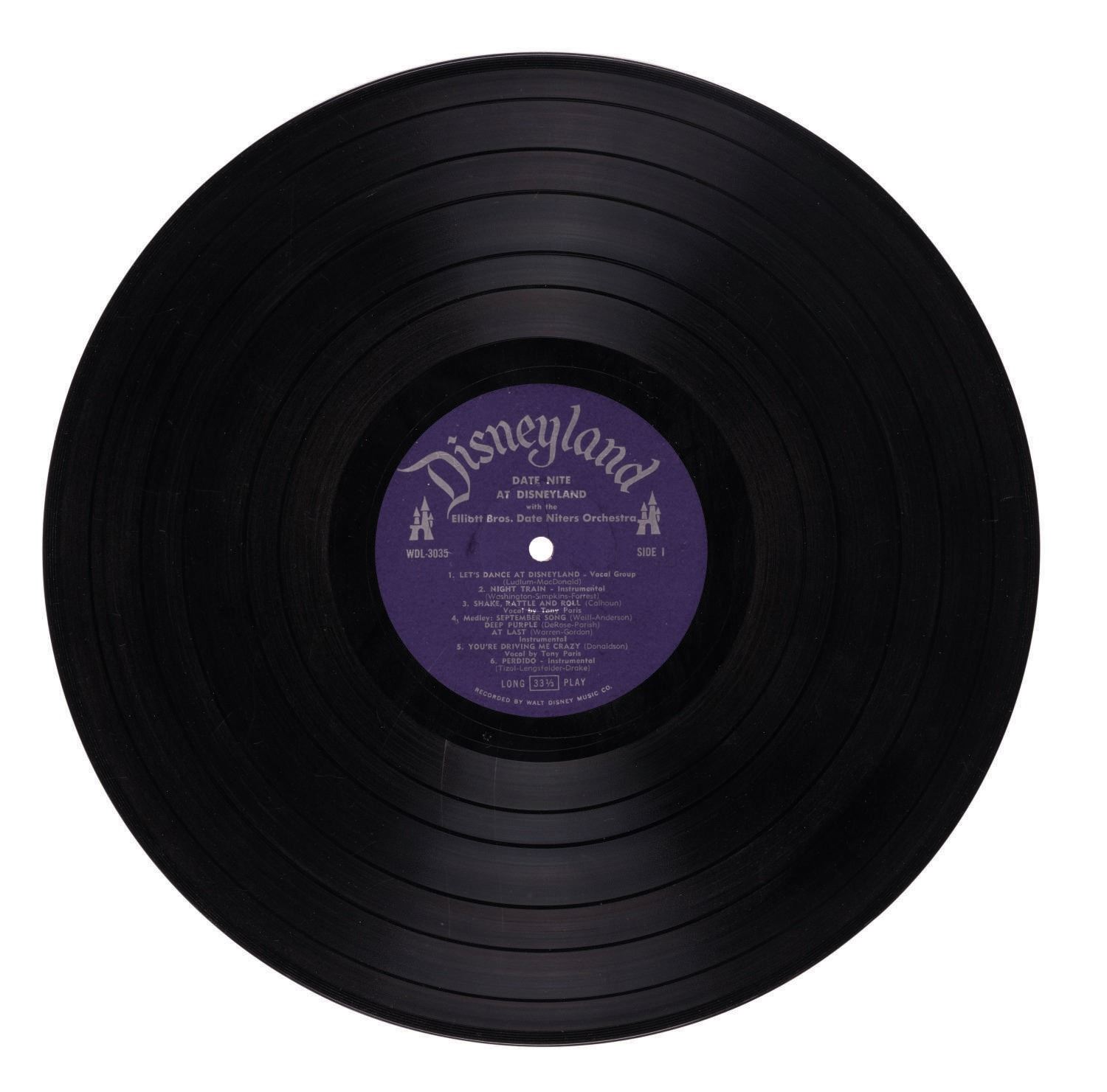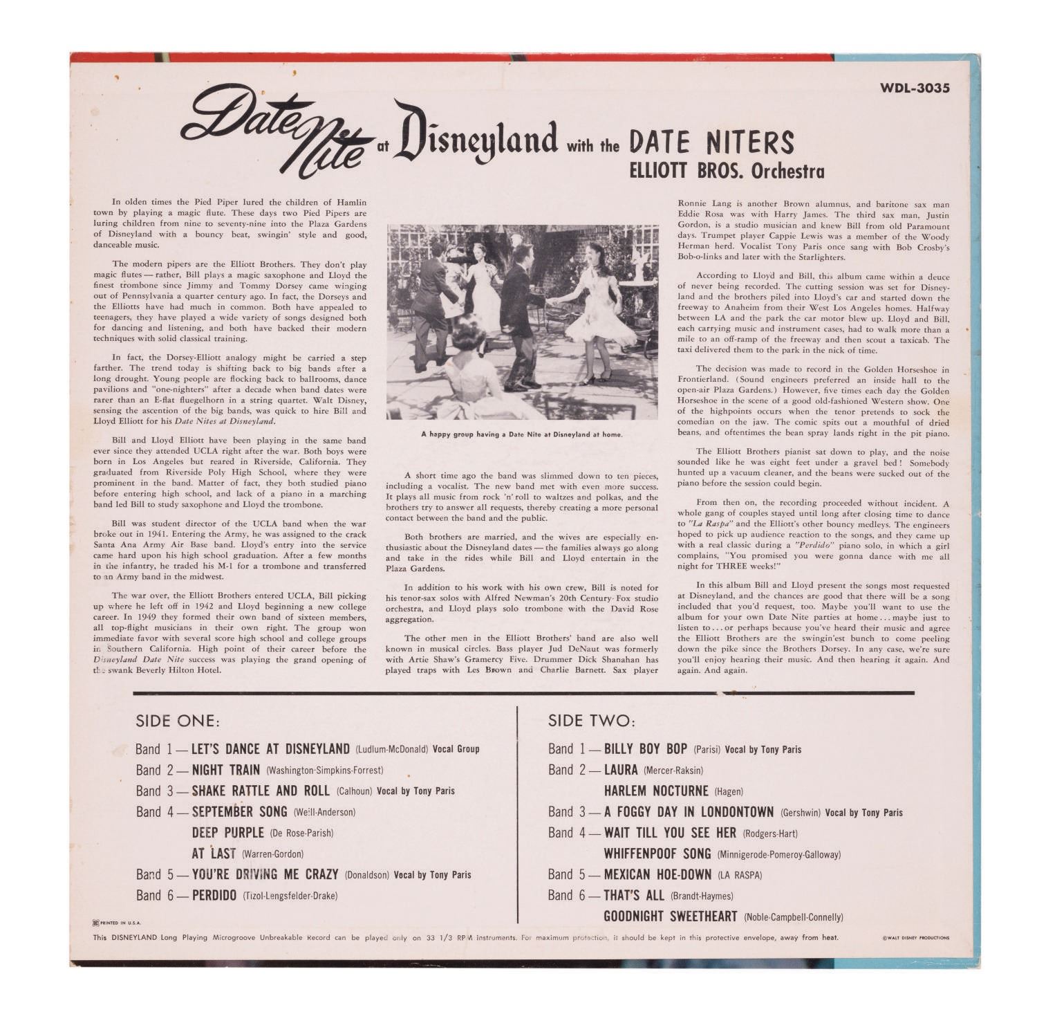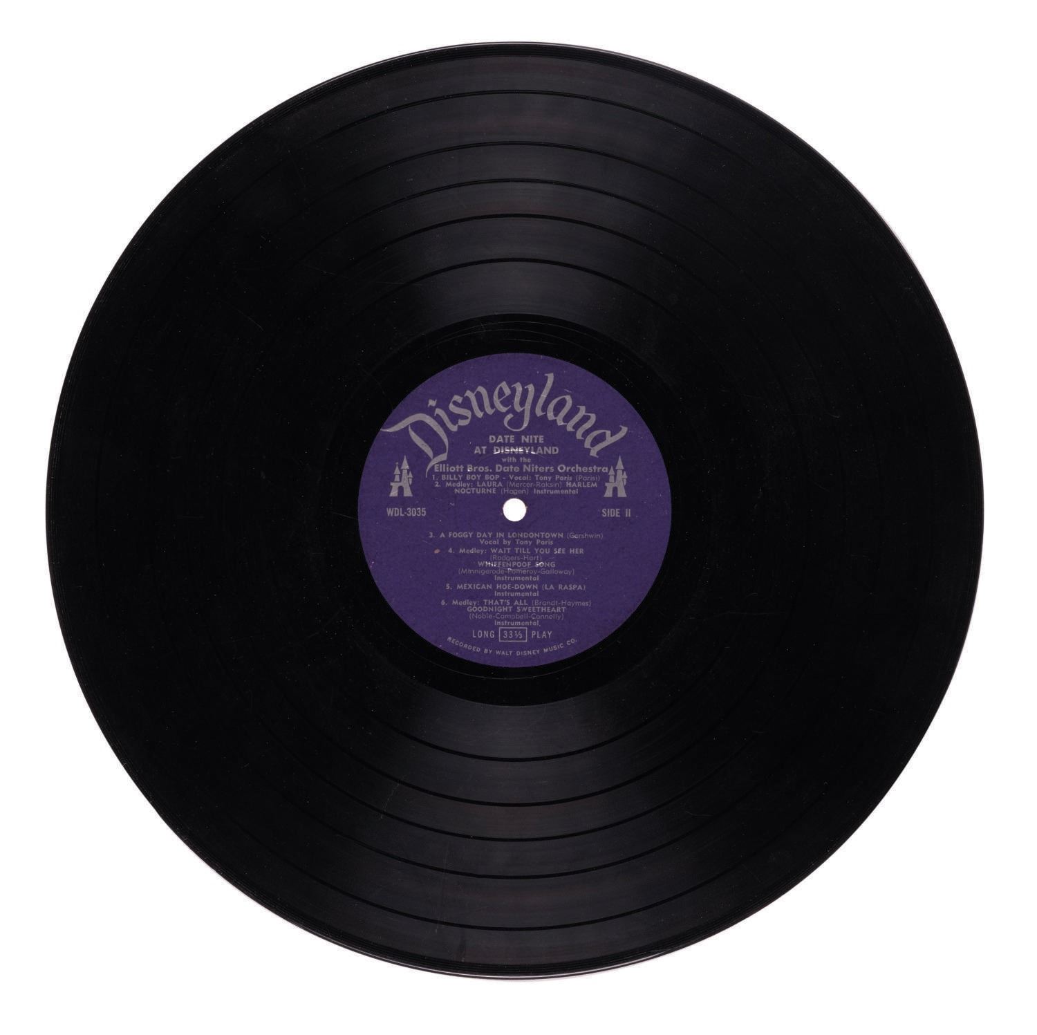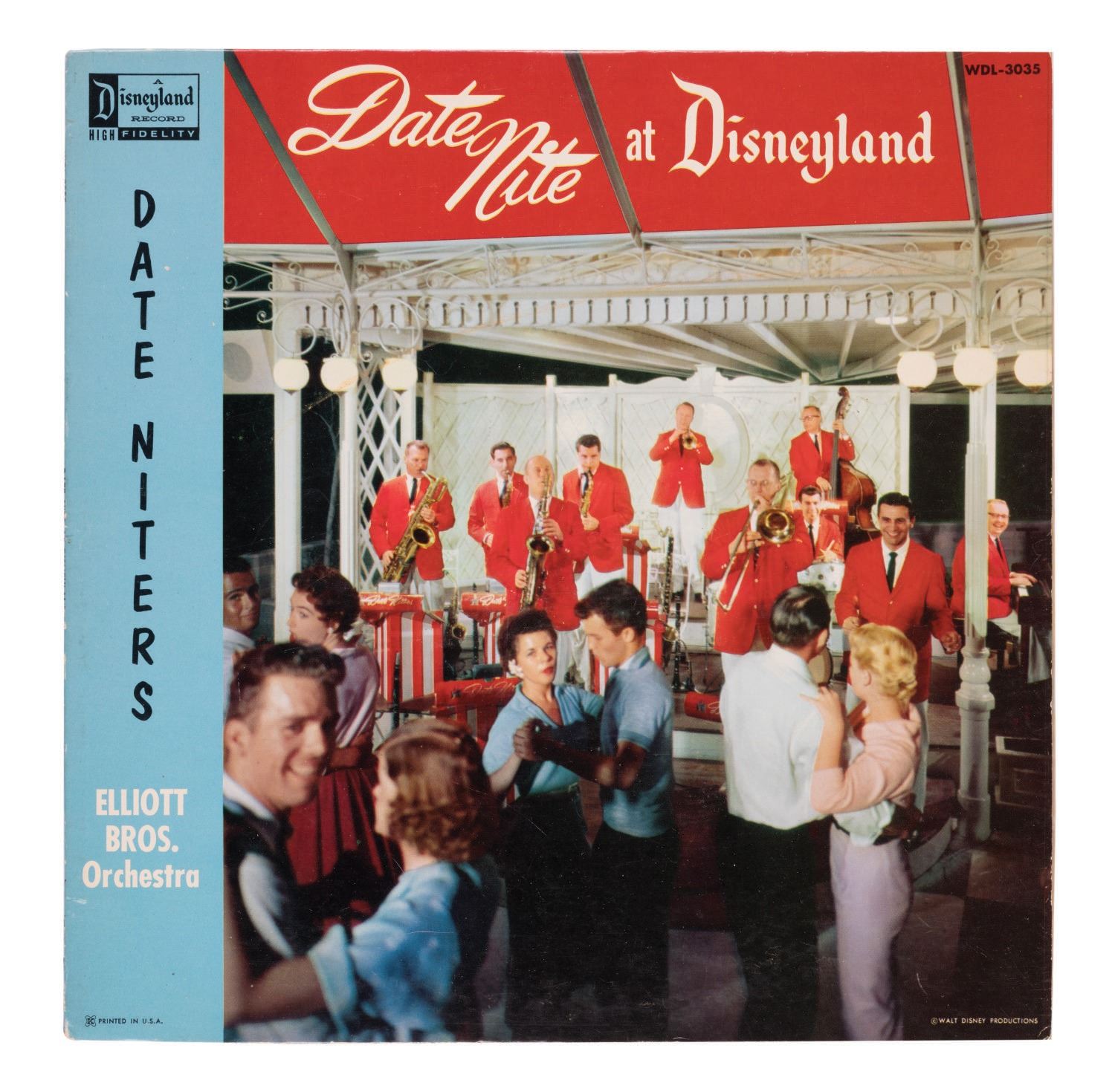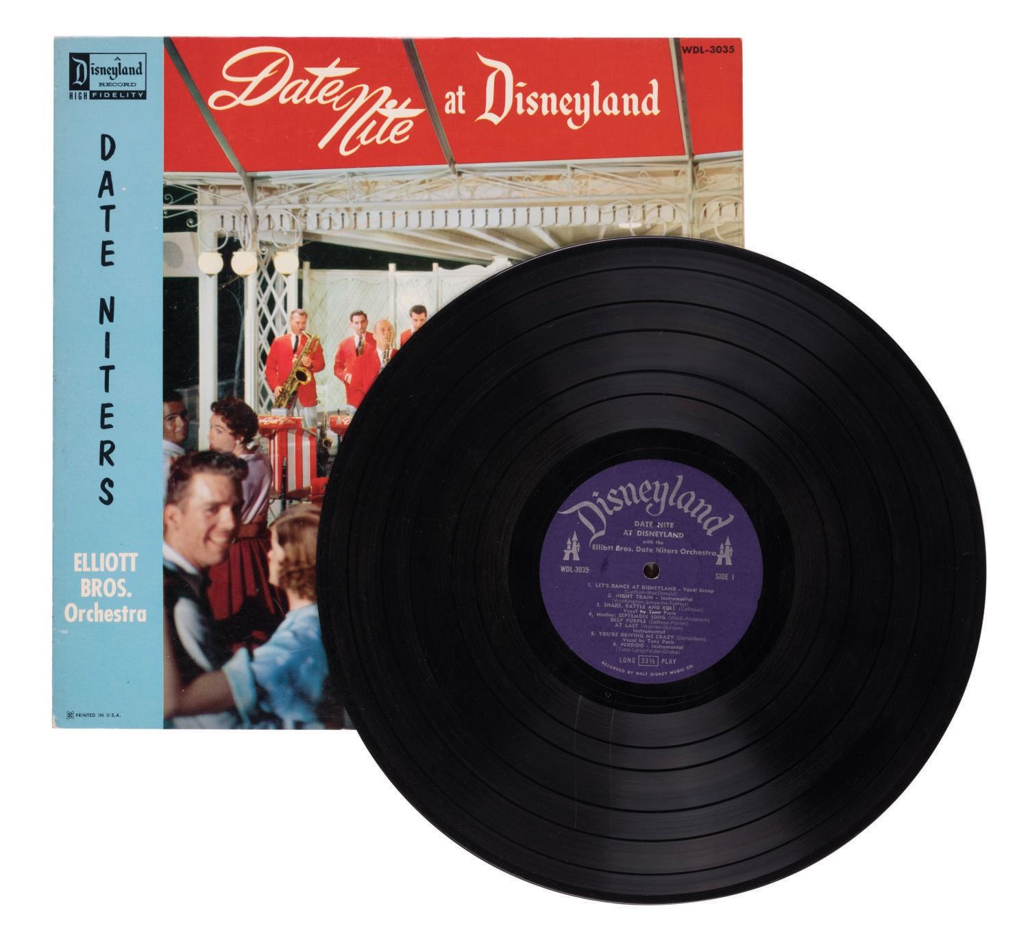 (Disneyland, 1958) An LP record titled "Date Nite at Disneyland." Meant as a promotional tie-in with the Park event, the record features music performed by the Elliott Bros. Orchestra. The back cover explains that in this album, Bill and Lloyd Elliott "present the songs most requested at Disneyland." Measuring 12.5"x12.5", the record sleeve is in very good condition with minor edge-wear, and the record in good condition with some scratches from use.