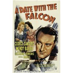 <B>A Date with the Falcon (RKO, 1941)</B></I> One Sheet (27" X 41"). This is the second entry in RKO Radio's "Falcon" series that stars George Sanders as private-eye Gay Lawrence aka the Falcon. In this entry Lawrence is on the case of a missing scientist who has developed a synthetic-diamond process. Inspector O'Hara (James Gleason) fears the formula has fallen into the wrong hands and solicits the help of the "Falcon" to bring the crooks to justice. There is a touch of wear at the crossfolds, a small scratch and a couple of pinholes. The poster has been restored, minimizing these minor defects. Very Fine on Paper.