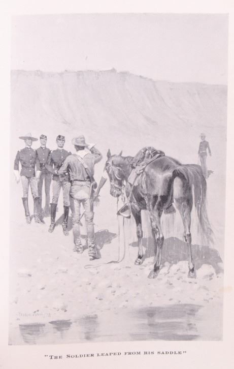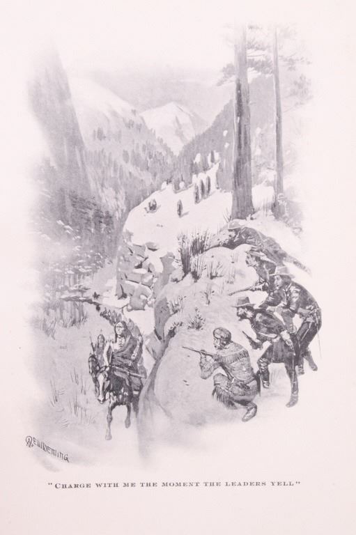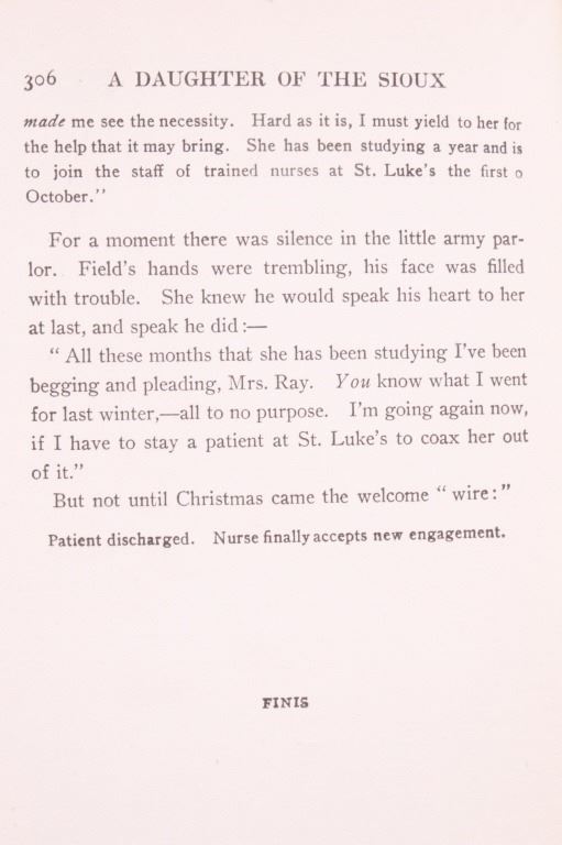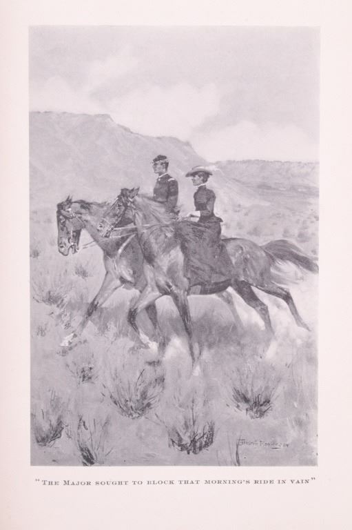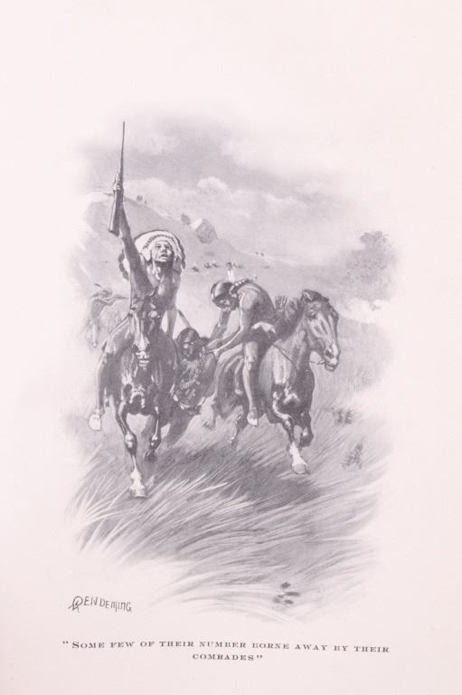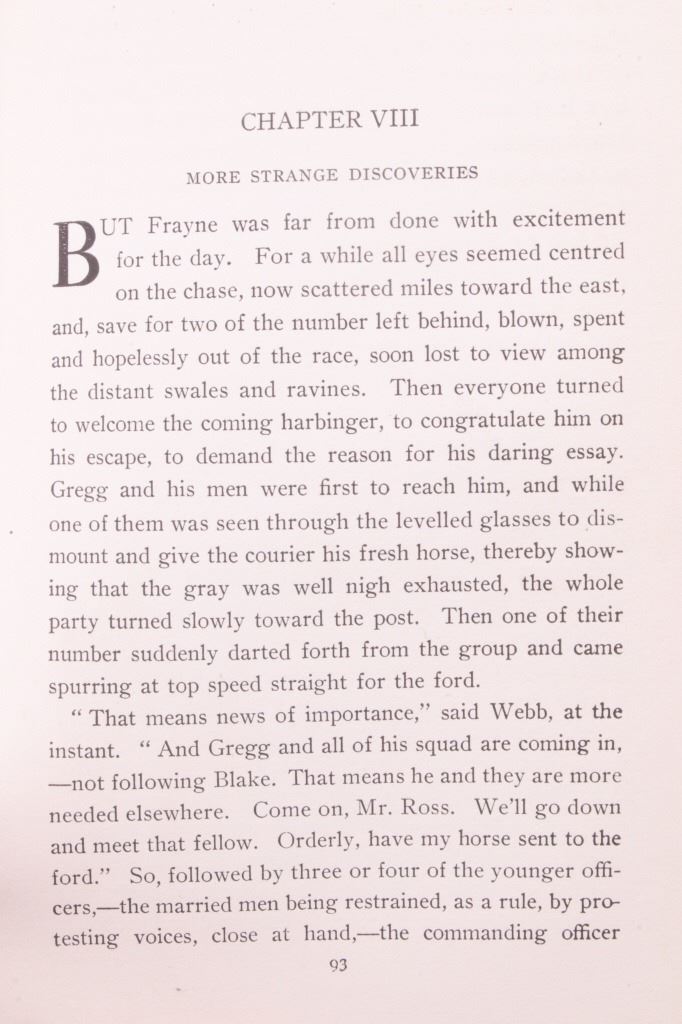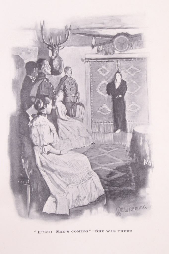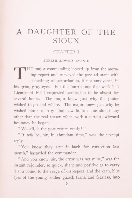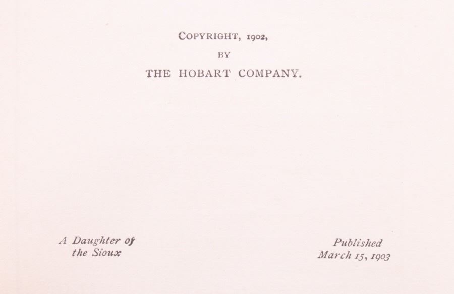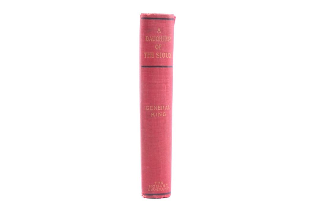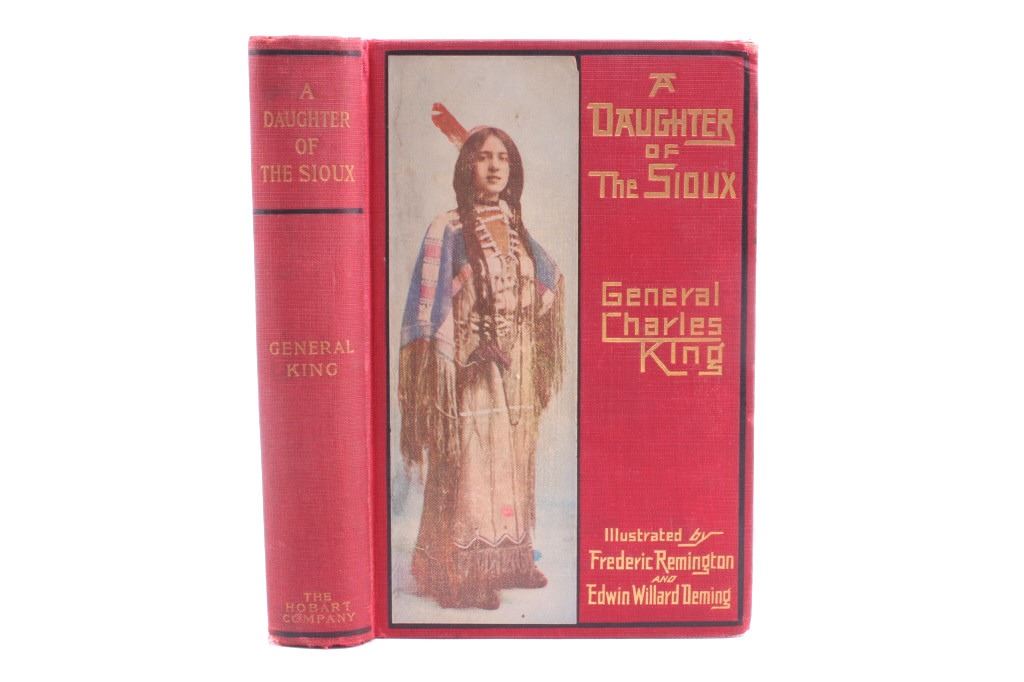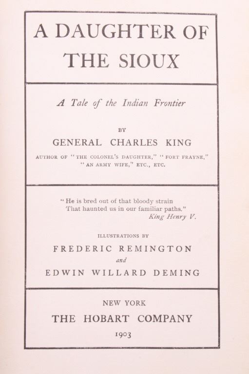 This is a rare edition of "A Daughter of the Sioux" by Gen. Charles King, published in 1903 by The Hobart Company. It is illustrated by the famous Frederick Remington and Edwin Willard Deming. "A Daughter of the Sioux" is a classic tale of the Old West and the demise of the Indian. The book was written by Gen. Charles King, a United States soldier and a distinguished writer. He graduated from West Point in 1866 and served in the Army during the Indian Wars under George Crook. He was wounded in the arm, forcing his retirement from the regular army. During this time, he became acquainted with Buffalo Bill Cody. King would later write scripts for several of Cody's silent films. He wrote and edited over 60 books and novels. The book's construction is in good condition, with slight wear on the spine and the front cover. The book measures 51/2" X 71/2".