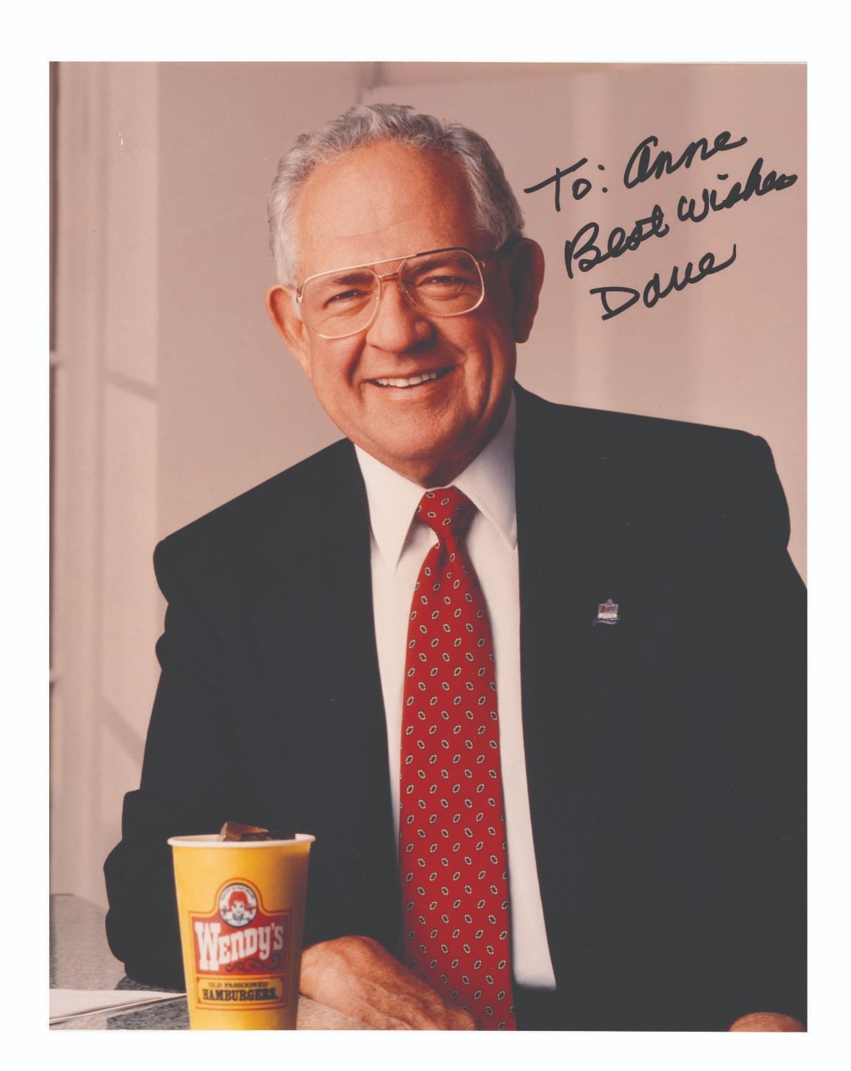 (Thomas, 1980s/90s) A photograph of fast food chain Wendy’s founder Dave Smith, signed with a dedication. Thomas famously appeared in commercials for Wendy’s, giving the restaurant a self-deprecating, folksy spokesperson. Measuring 8" x 10", the signed photograph is in very good condition with very light handling wear.