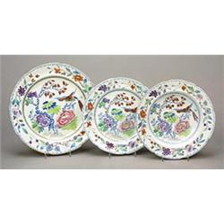 A Davenport Stone China 'pattern 6' part dinner service, printed in blue and painted in colours and gilt with a long-tailed exotic bird amonst oriental flowering shrubs, comprising; two soup plates, twelve entree plates, thirteen dinner plates, blue printed marks, circa 1820 (extensive damage) (see illustration) £200-300