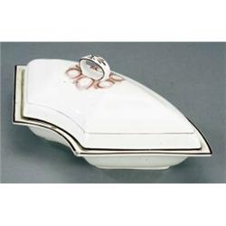 A Davenport creamware segmental supper dish and cover, painted in brown with waterlily leaves, 15in wide, impressed mark