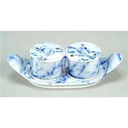 A Davenport flow-blue inkwell set, comprising two circular inkwells, each with a central conical well and three peripheral pen holes, together with an oval stand with raised handles, all printed with an overall marble pattern, stand length 20.2cm, printed name marks on all three pieces and impressed anchor mark with date numerals 48 on the stand (small chip to one raised rim on stand)