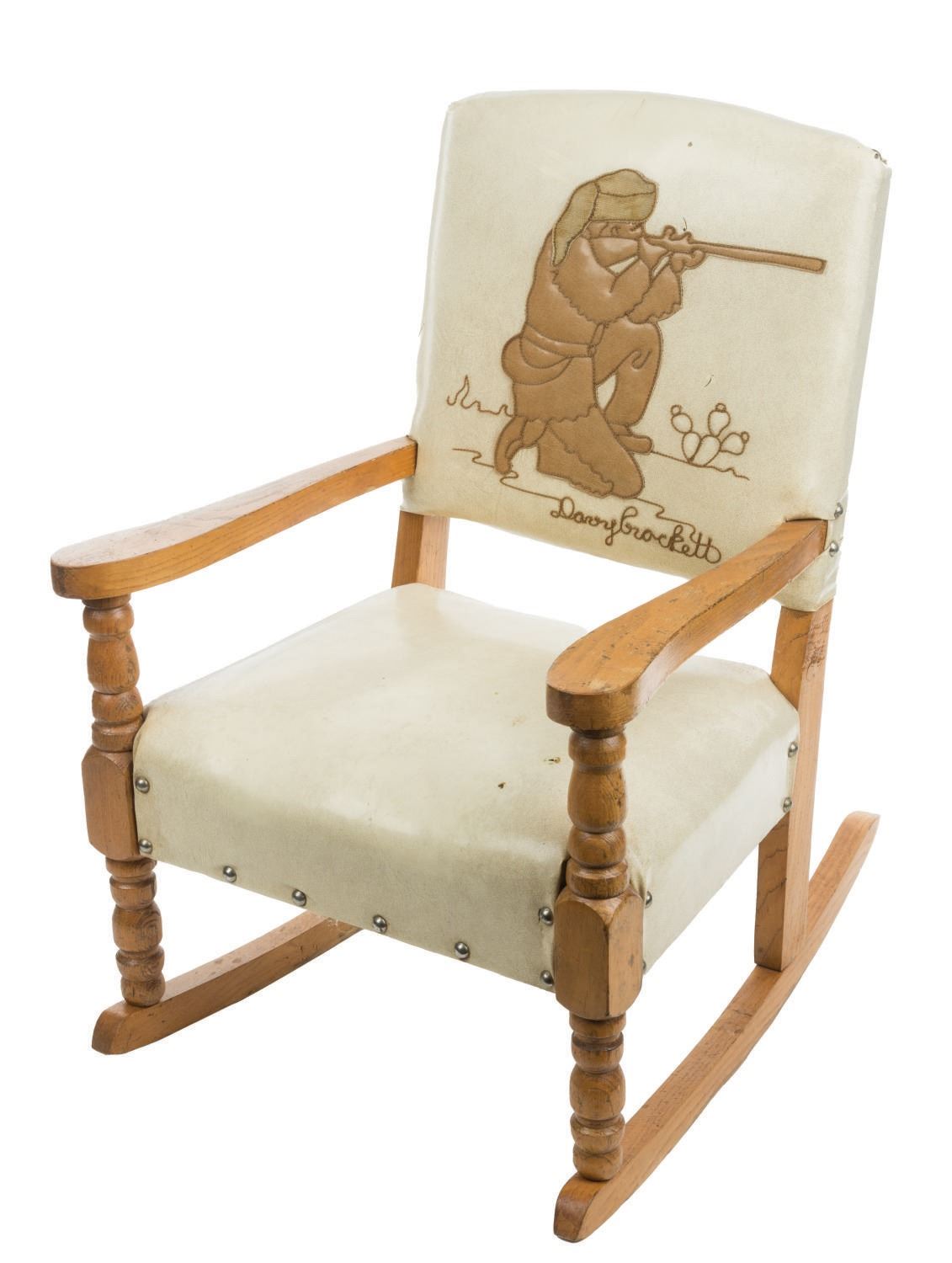 (Unknown, 1950s) A Davy Crockett child's rocking chair. Featuring wood, metal, and vinyl covering and imagery, the chair measures 16"x20.5"x23" tall. The chair is in very good overall condition, despite slight wear to vinyl, and scuffs and scratches to wooden components.