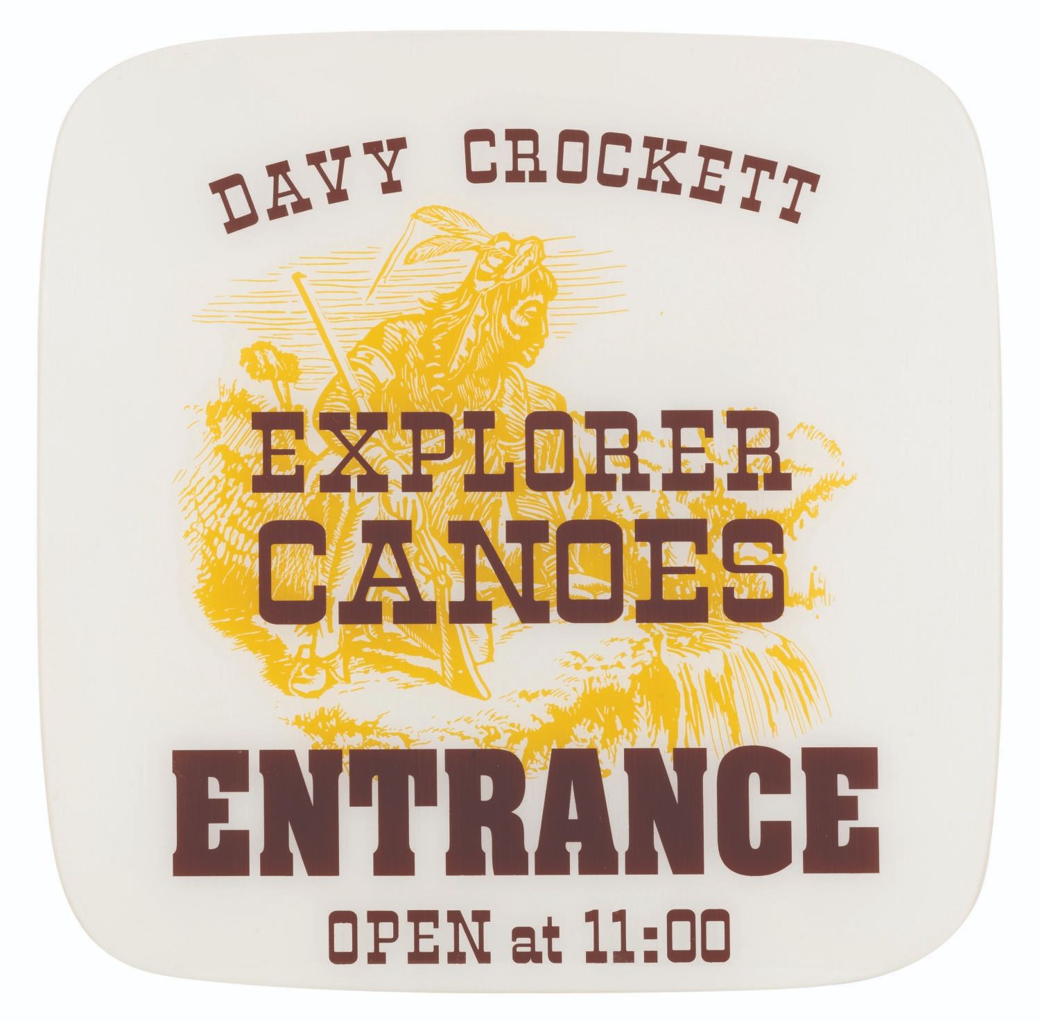 (Disneyland, 1980s-2000s) A Park-used sign originally displayed at the entrance to Disneyland's Davy Crockett's Explorer Canoes. Measuring 18” x 18”, the acrylic sign is in very good condition with wear from Park use including plaster residue and mounting adhesive on the reverse from removal.