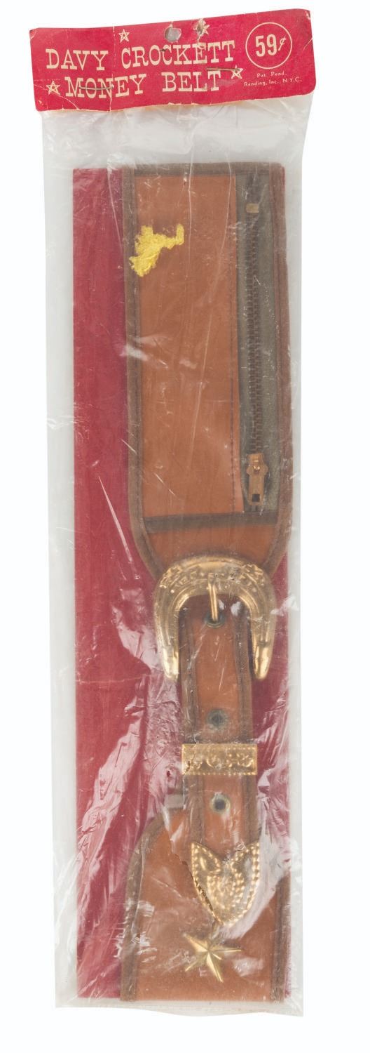 (Randing Inc., 1950s) A Davy Crockett Money Belt by Randing Inc. The fabric, leatherette, and metal belt contains a compartment for carrying money. Measuring 29.5" long, the belt is in fine condition in the original fair condition package, which exhibits wear and tear to the paper and plastic throughout.