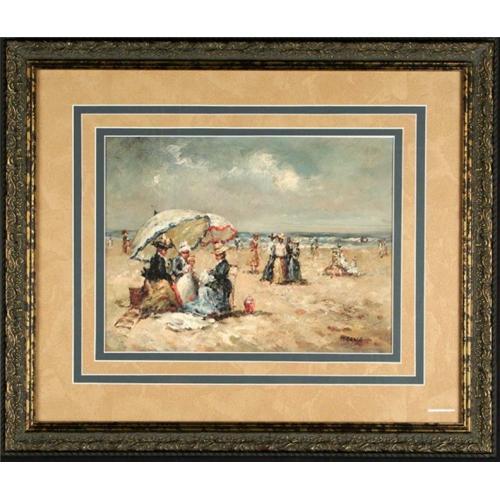 This masterfully printed scene exhibits all the techniques that define the artist?s unique style. The brightness of the sunlight hitting the sand is contrasted with the coolness of the blue dresses and sky. This is a charming scene that portrays a sense of nostalgia. It is exquisitely framed in a very expensive and highly ornate gold and black wood frame that adds a richness and elegance to the picture and is matted in a textured brown with blue double mat. The entire piece measures 23.5? x 27.25?. This is an excellent picture at an outstanding price making this an exceptional investment.