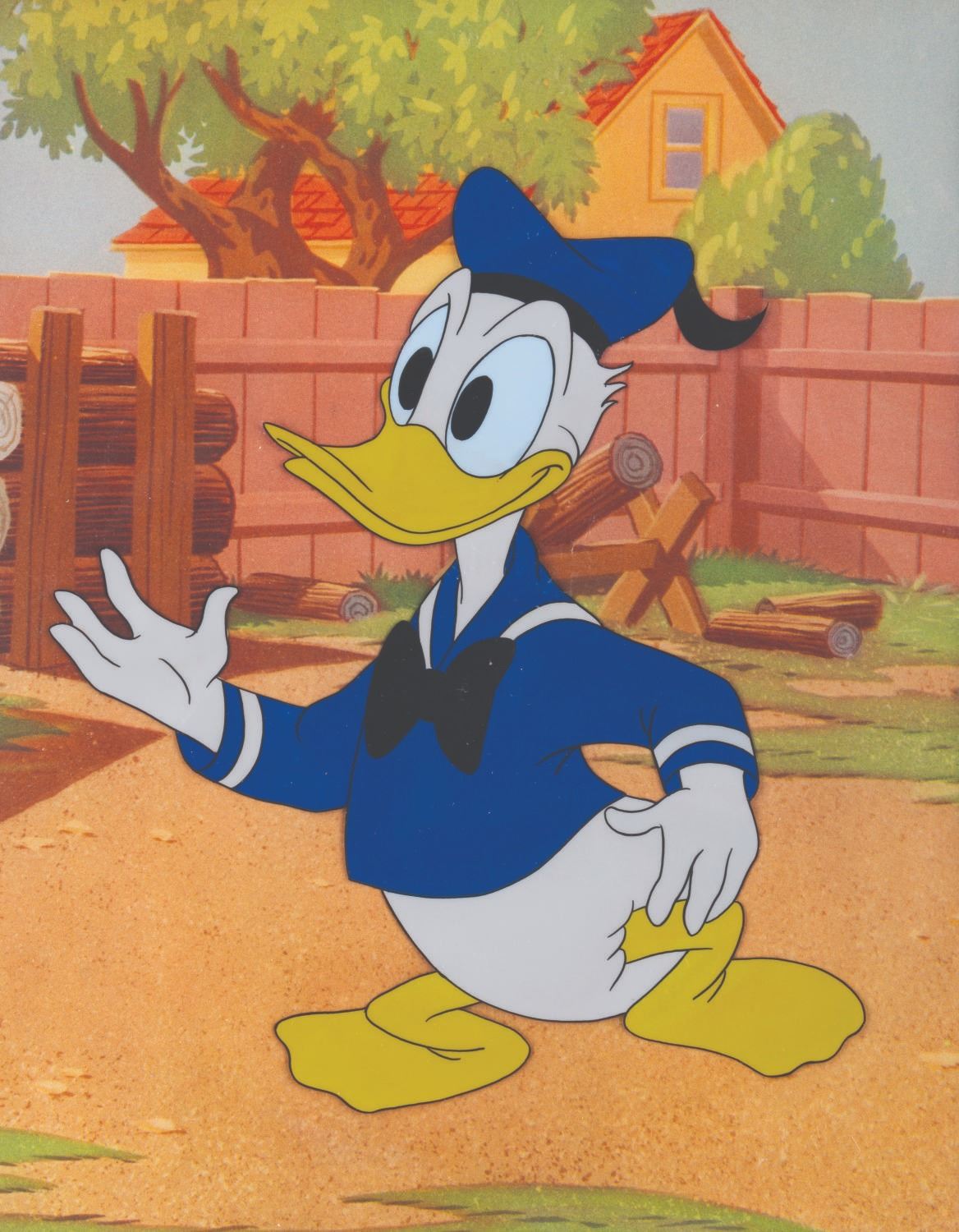(Disney, 1956) An original production cel of Donald Duck from the "Disneyland” episode, "A Day in the Life of Donald Duck," sold at the Art Corner in Disneyland. The cel was placed on a color copy background at the Studio and retains the original backing with the Art Corner gold label on the reverse. Donald has an image size of 7.5” x 6.5” on an 8” x 10” visible cel. The entire matted piece measures 12” x 14”. The cel displays in very good condition with light paint cracking to the bowtie, light warping from age, and discoloration to the matte.
