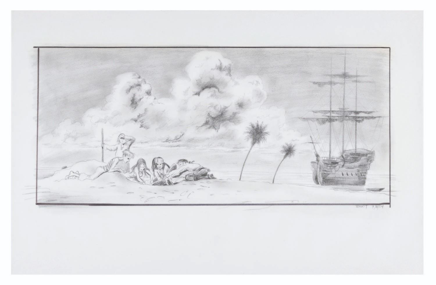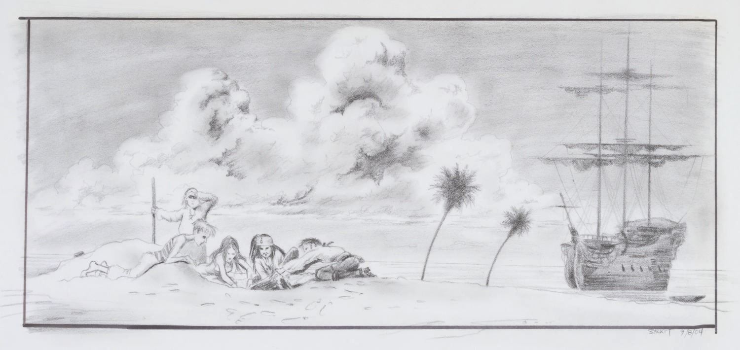 (Disney, 2004) A storyboard drawing accomplished in pencil of Jack Sparrow, Will Turner, Elizabeth Swann, Ragetti, and Pintel digging up the Dead Man's Chest in the second film of the "Pirates of the Caribbean" series. With an image size of 6.5" x 14.5" on 11" x 17" vellum paper, the piece is in very good condition