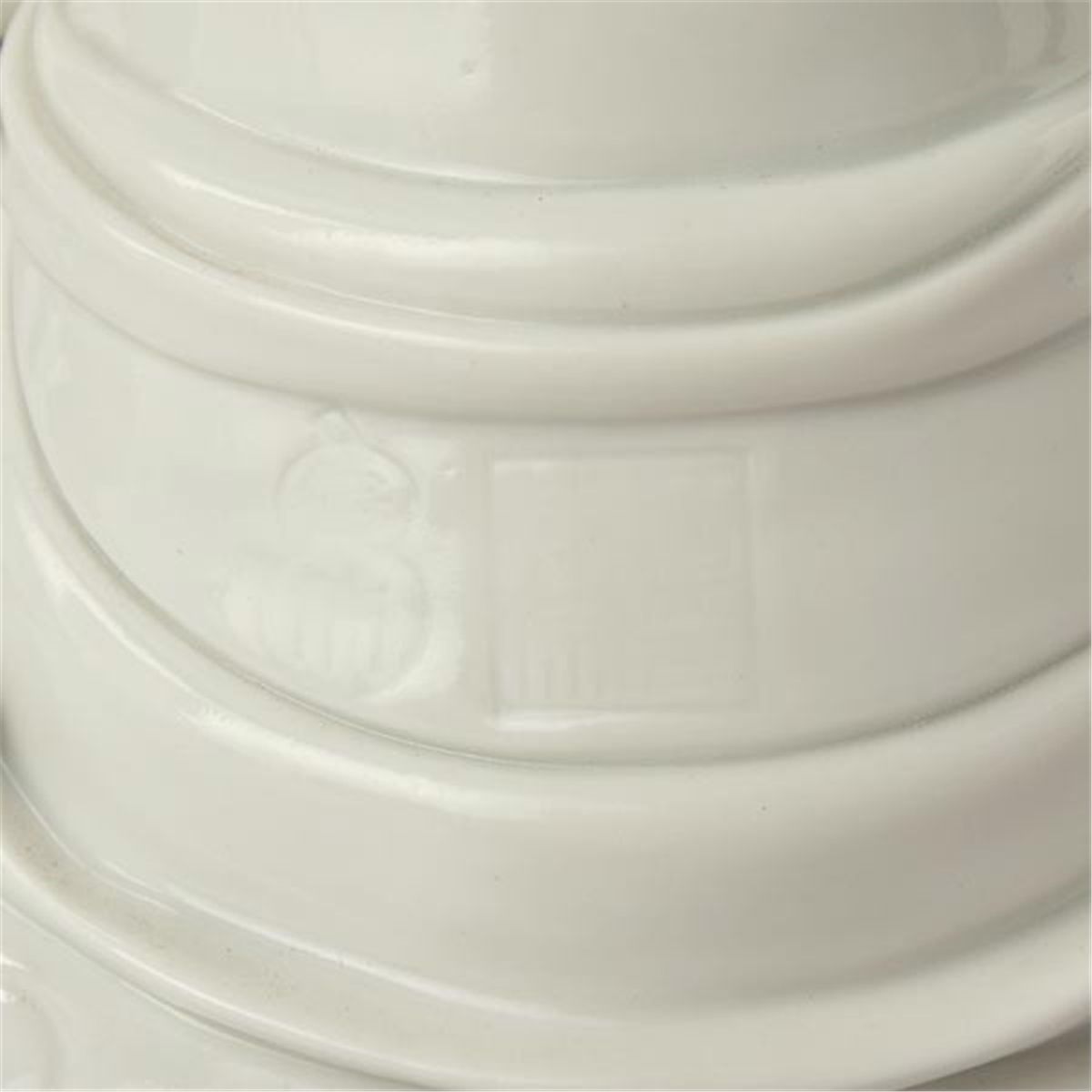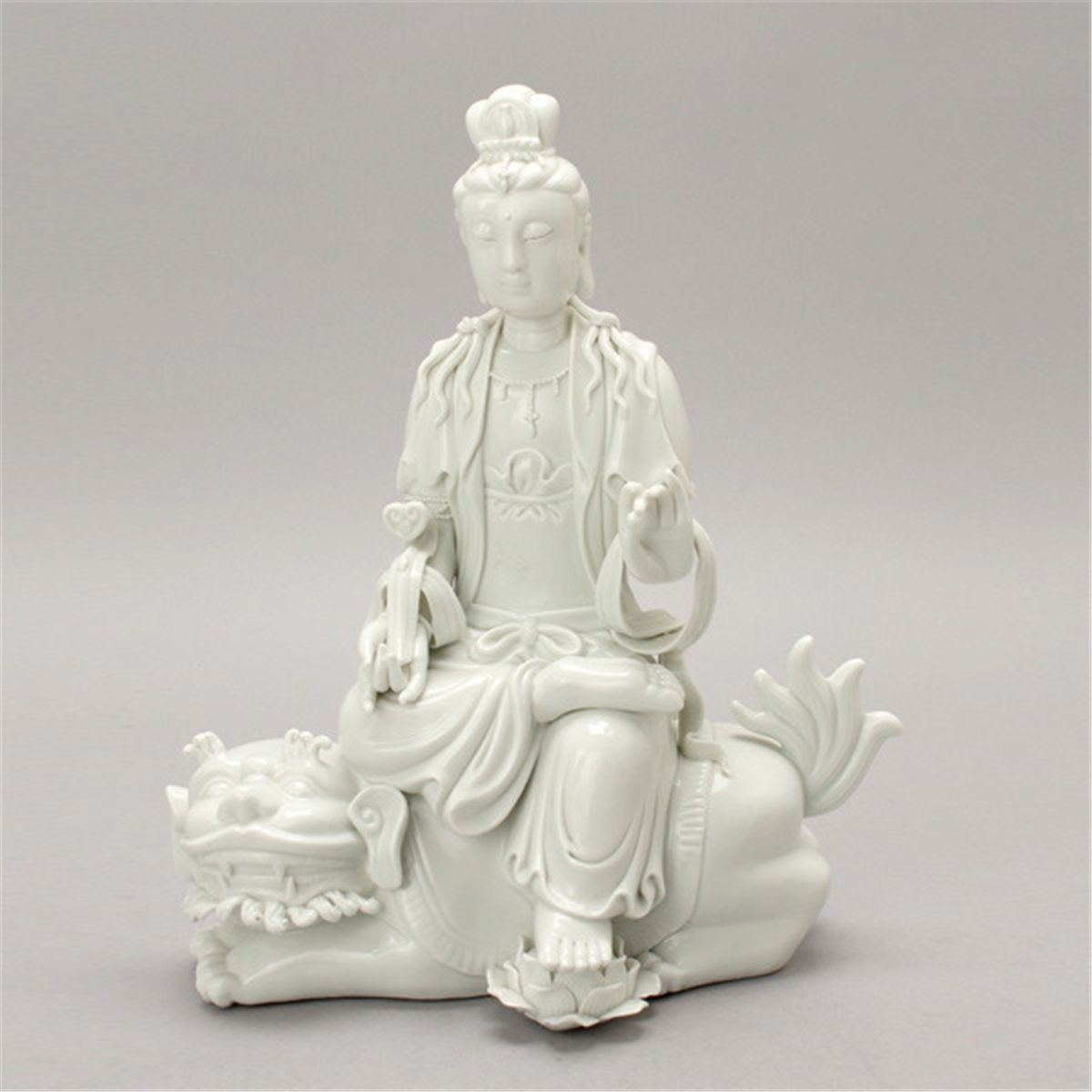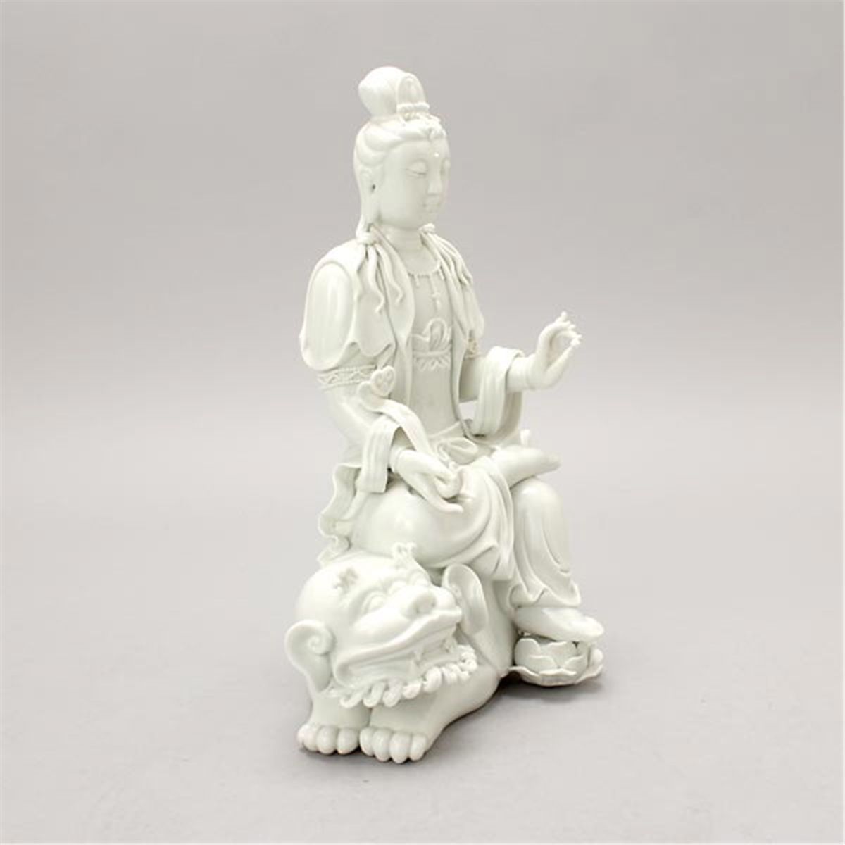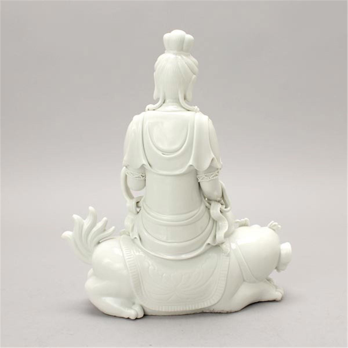 A Dehua Guanyin and Buddhistic Lion Group, the Goddess holding a ruyi scepter in her right hand and seated at royal ease on the benign recumbent beast, wearing a voluminous short-sleeved robe falling in soft folds on the beast's back, her long tresses caught in two bands falling over her shoulders, her back impressed with the double-gourd-shaped seal-mark and a 'He Chaochun' seal {Height: 12 1/2 inches (31.7 cm)}