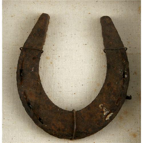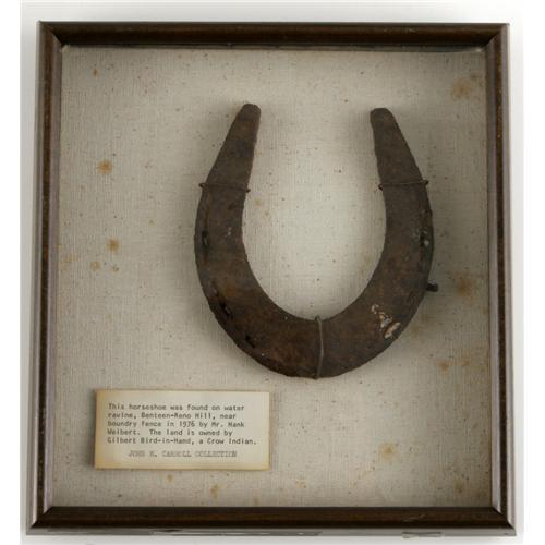 <B>A Delightful Relic of Custer's Last Stand. A Horseshoe Found on the Battlefield Where Custer and His Men Perished under the Swarming Sioux.</B></I> Custer was one of the most celebrated, and controversial, Civil War figures. Graduating last in his 1861 West Point class, he built a reputation for daring and brilliance, and in 1863 became a brigadier general. Until the end of the war, Custer fought with the utmost distinction in all the cavalry battles of the Army of the Potomac. He commanded a division in the Shenandoah and cut off Lee's escape at Appomatox. After the war he remained in the army fighting Indians and died at Little Big Horn. A rare relic recovered from the site of Custer's "Last Stand" on the Little Big Horn, an iron horse shoe with one nail, attached to a linen backing with descriptive note, all set into a wood frame. The note of provenance reads: "This horseshoe was found on water ravine, Bentenn-Reno Hill, near boundary fence in 1976 by Mr. Hank Weibert." The land is owned by Gilvert Bird-In-Hand, a Crow Indian.