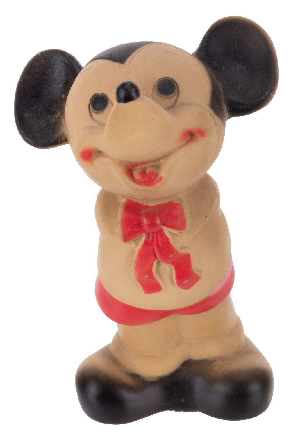 (Dell, 1950s-60s) A Mickey Mouse rubber toy manufactured by Dell. Measuring 6.25" tall, the toy displays in good condition with heavy paint loss, pinholes, wear from age, and unpainted on the reverse.