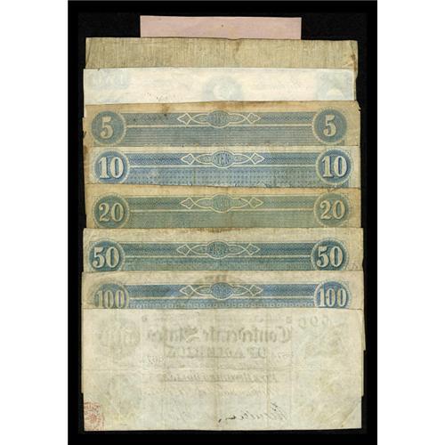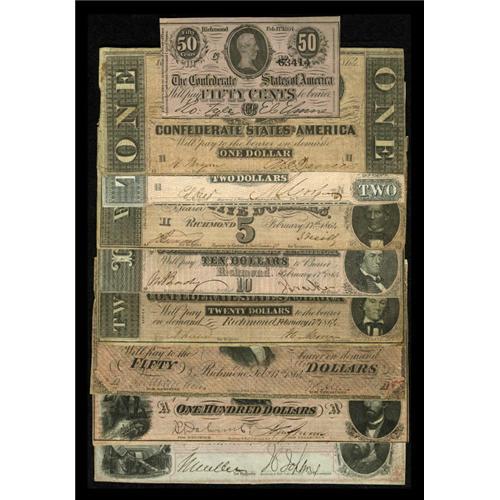 <B>A Denomination Set of 1864 Confederate Notes:</B></I><BR> T64 $500 1864 <B>Very Fine</B></I>,<BR>T65 $100 1864 <B>Very Fine</B></I>,<BR>T66 $50 1864 <B>Fine</B></I>,<BR>T67 $20 1864 <B>Fine</B></I>,<BR>T68 $10 1864 <B>Very Fine</B></I>, with a minor edge split,<BR>T69 $5 1864 <B>Very Fine</B></I>, with minor stains and edge chinks,<BR>T70 $2 1864 <B>Very Fine,</B></I><BR>T71 $1 1864 <B>Fine-Very Fine</B></I>,<BR>and a T72 50 Cents 1864 <B>Extremely Fine+</B></I>.<BR><BR><b>Shipping:</b> Coins & Currency (<a target="_blank" href="http://www.heritageauctions.com/common/shipping.php">view shipping information</a>)