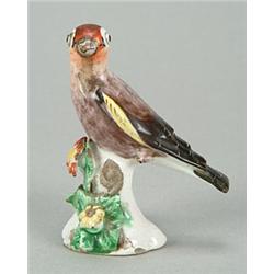 A Derby model of a goldfinch, perched on a flower-encrusted base, painted with coloured enamels, 8.5cm high, circa 1765 (some chips and losses)