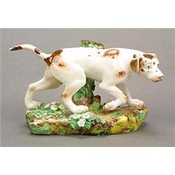 A Derby model of a pointer, en passant before a tree-stump, on a flower-encrusted mound base, the hound painted with liver patches, 18cm in length, early 19th century (restored tail) (see illustration) £600-800