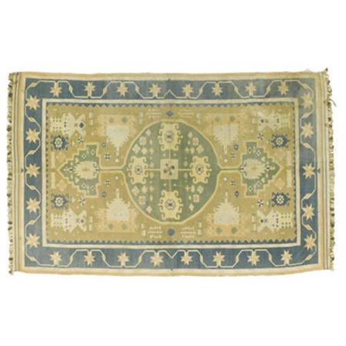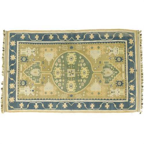 <B>A Dhurrie Rug</B></I><BR><BR>Unknown maker, India<BR>Twentieth century<BR>Cotton<BR>Unmarked<BR>82 x 48-1/2 inches (208.3 x 123.2 cm)<BR> A finely woven dhurrie rug with green medallion with stylized geometric decoration on tan ground and blue border.<BR><BR><BR><b>Shipping:</b> Requires 3rd Party Shipping (<a target="_blank" href="http://www.heritageauctions.com/common/shipping.php">view shipping information</a>)