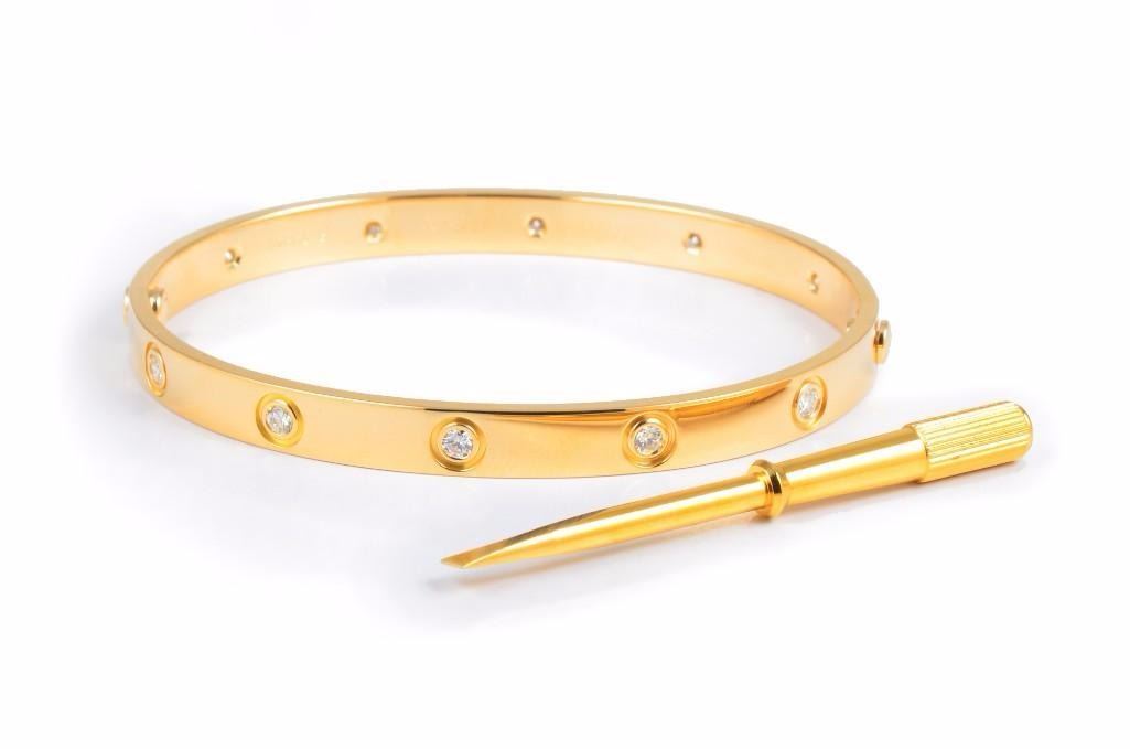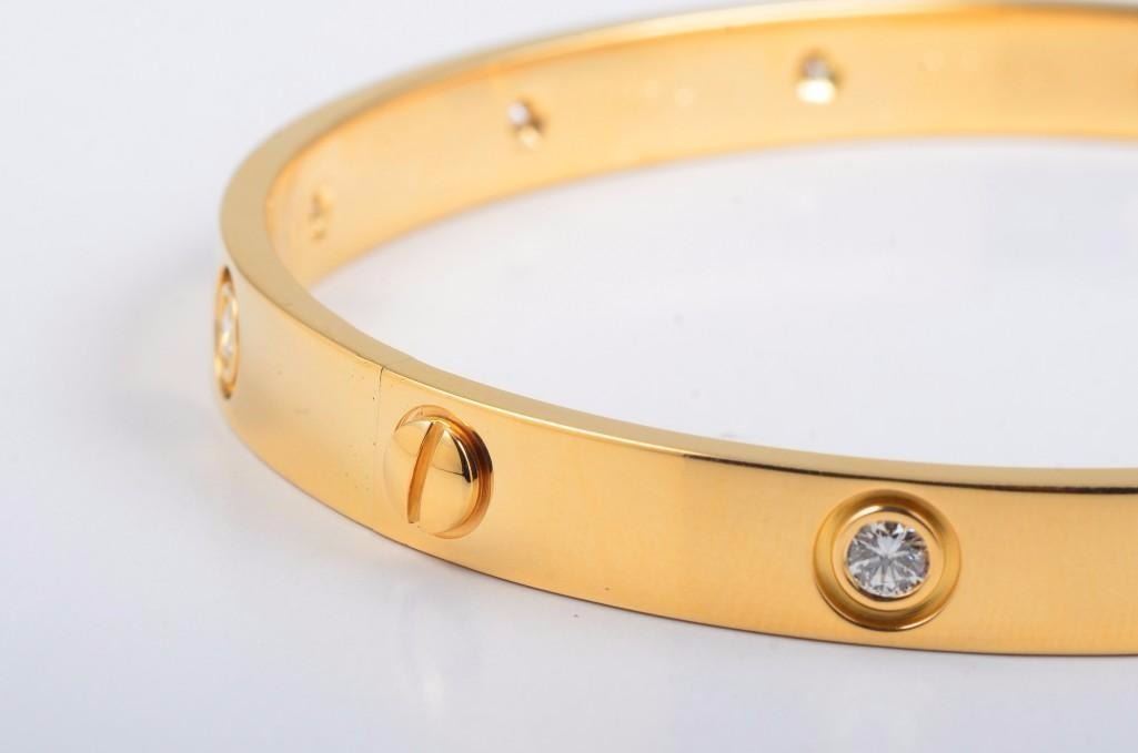 Cartier 18K yellow gold love bangle bracelet with 10 diamonds weighing approximately 1 carat; with original box and receipt for polish; signed Cartier 750-19 F39846;size 19; weight 33.21g; like new condition.
