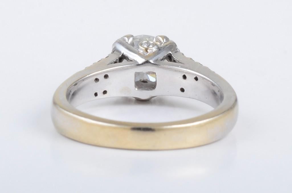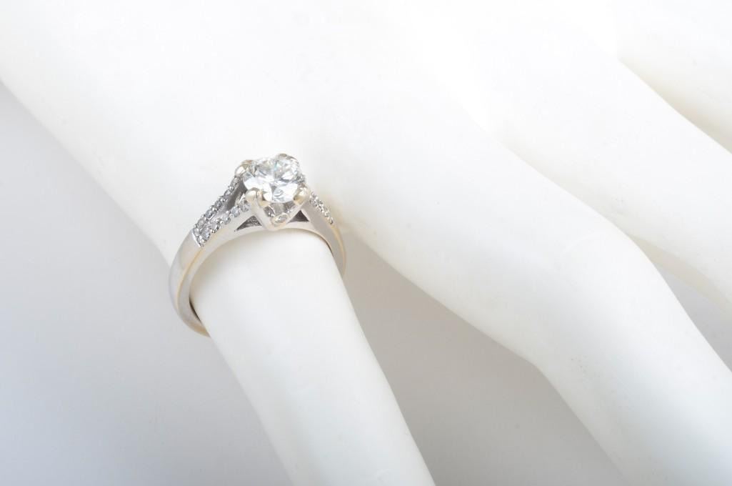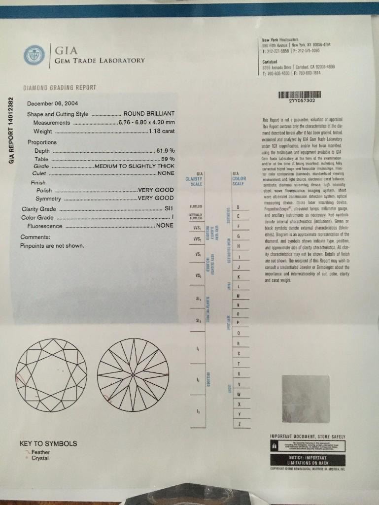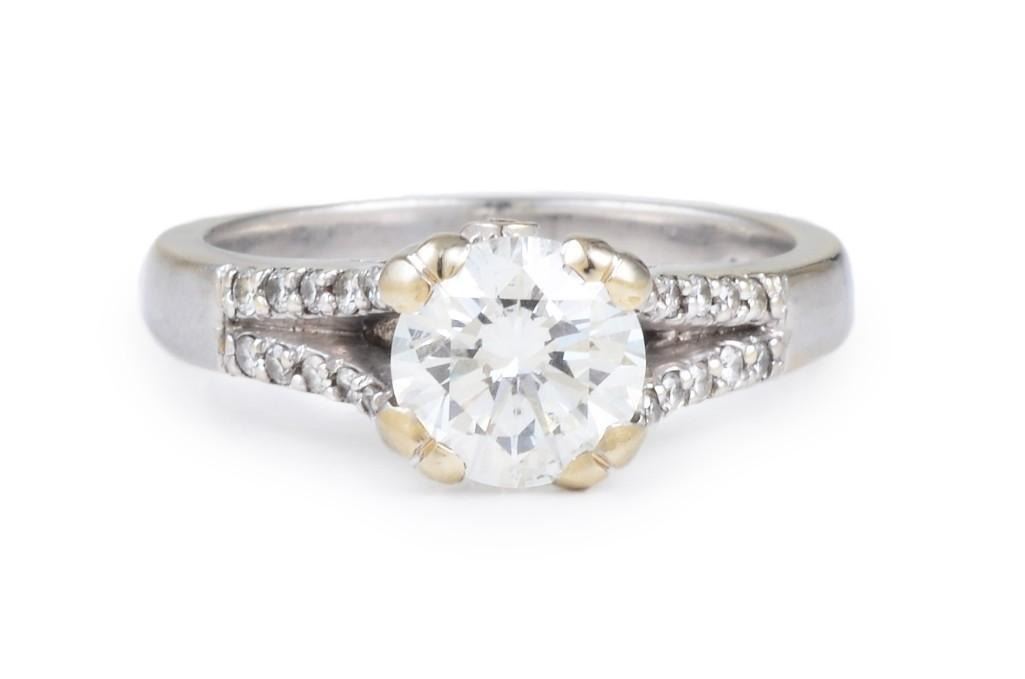 Solitaire diamond ring with two small diamonds bezel-set on either side of the main mounting. Shoulders are pav set with 20 small diamonds. Main stone weighs 1.18 carats, I-SI1 with GIA certificate. Total weight of small diamonds approximately .22 carat. Stamped 14K TNG. Ring size 5 1/2. Weight 4.8g.