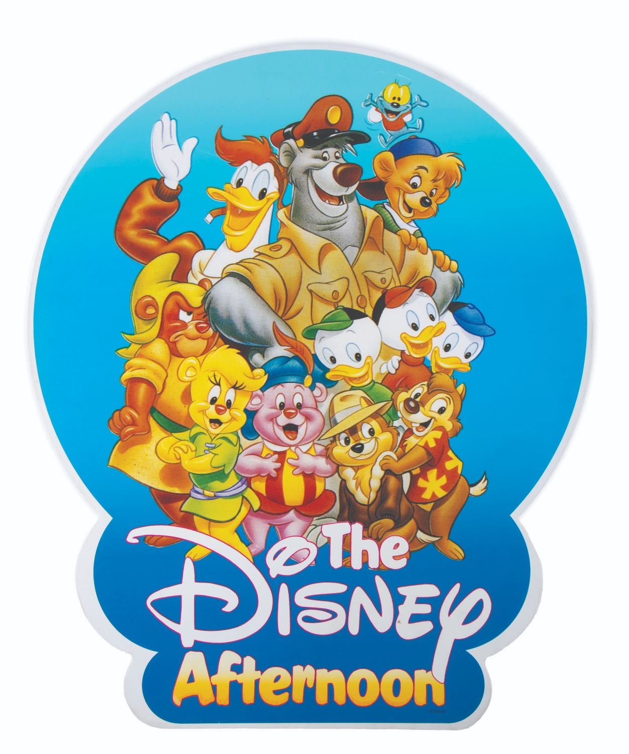 (Disneyland, 1991) An original lamppost sign used to promote "The Disney Afternoon" to guests. The popular two-hour programming block featured such well-remembered Disney animated programs as "TaleSpin," "Chip ‘n Dale: Rescue Rangers," "Adventures of the Gummi Bears," and "DuckTales." Measuring 19.25" x 23.25", the lampost is in very good condition with some light smudging, very few scratches, and minimal indentations.