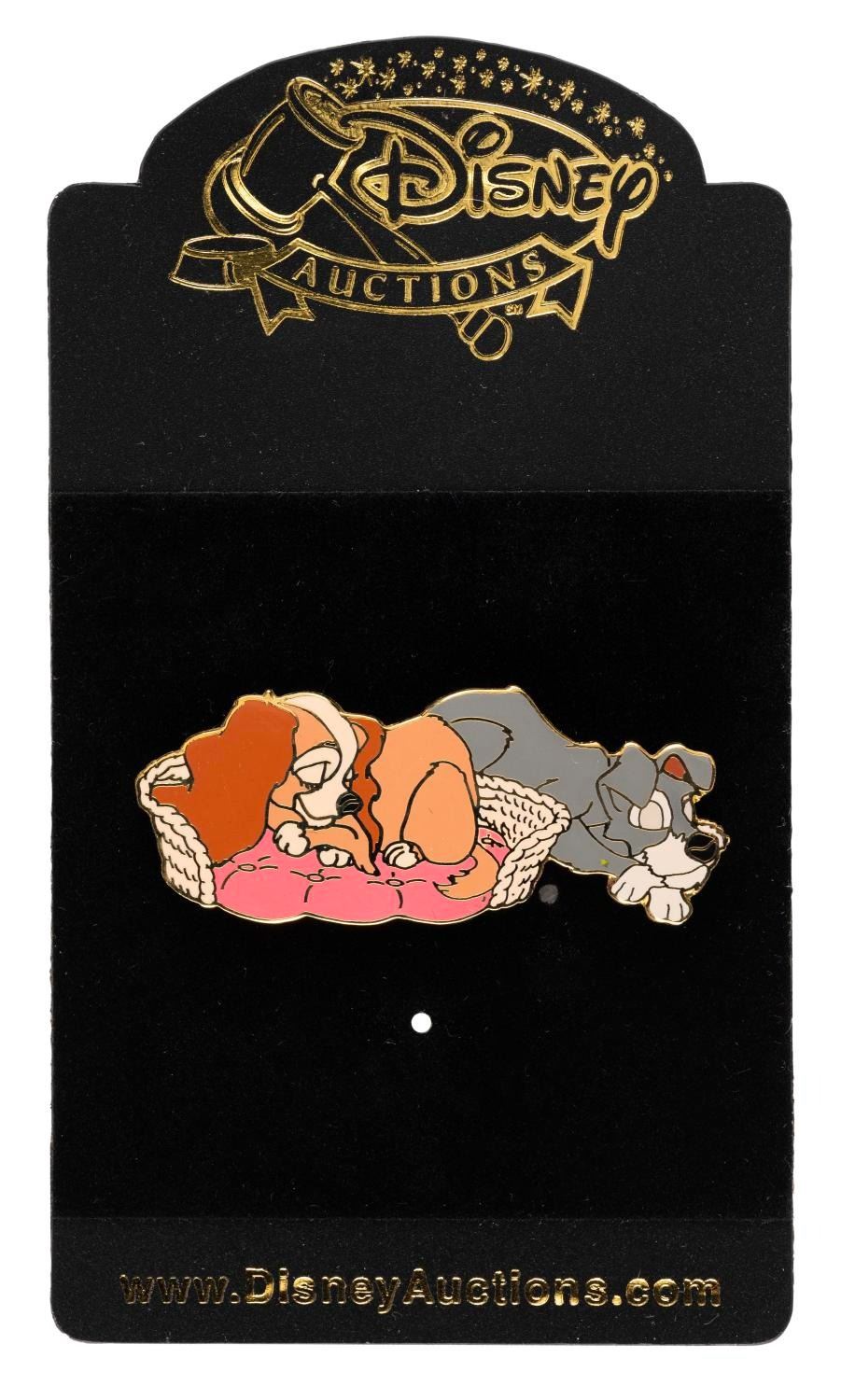 (Disney, 2004) A Disney Auctions Lady and Tramp sleeping pin, released in a limited edition of 1000. Measuring 1” x 2”, the pin is in very good condition with light scratches.