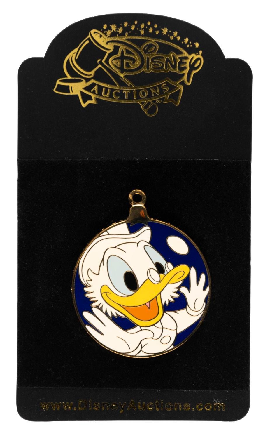 (Disney, 2003) A Disney Auctions Uncle Scrooge holiday ornament pin. Released in a limited edition of only 250, the pin measures 1.75” in diameter and is in fine condition, on the original card.