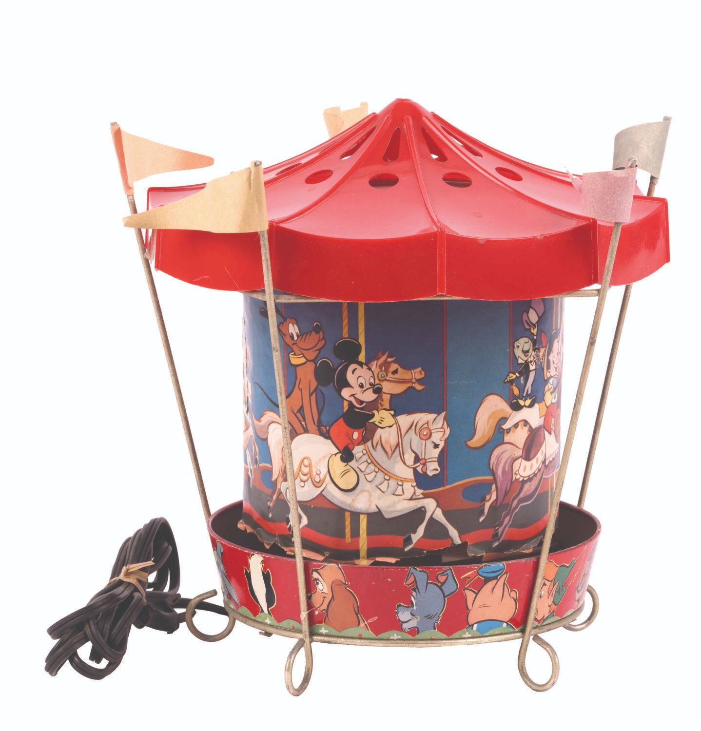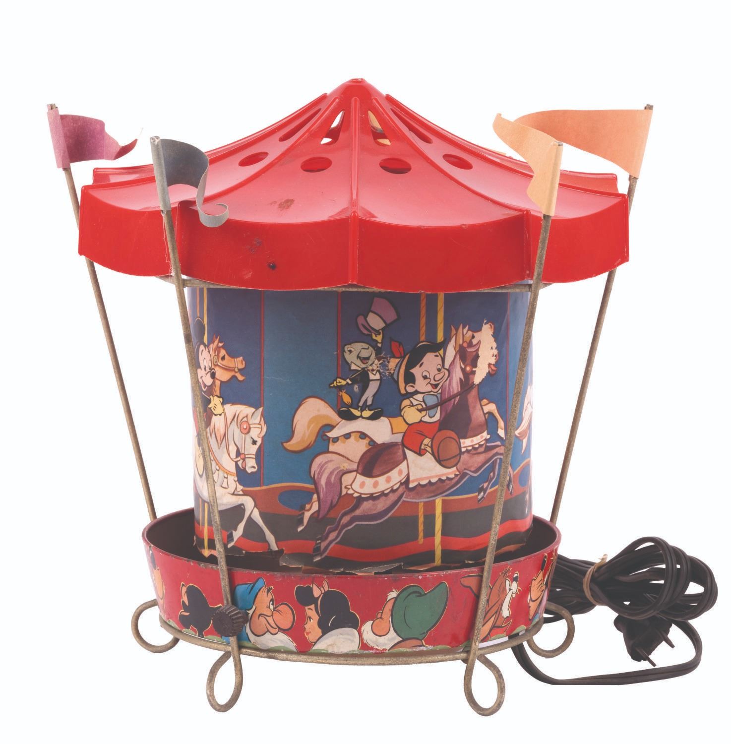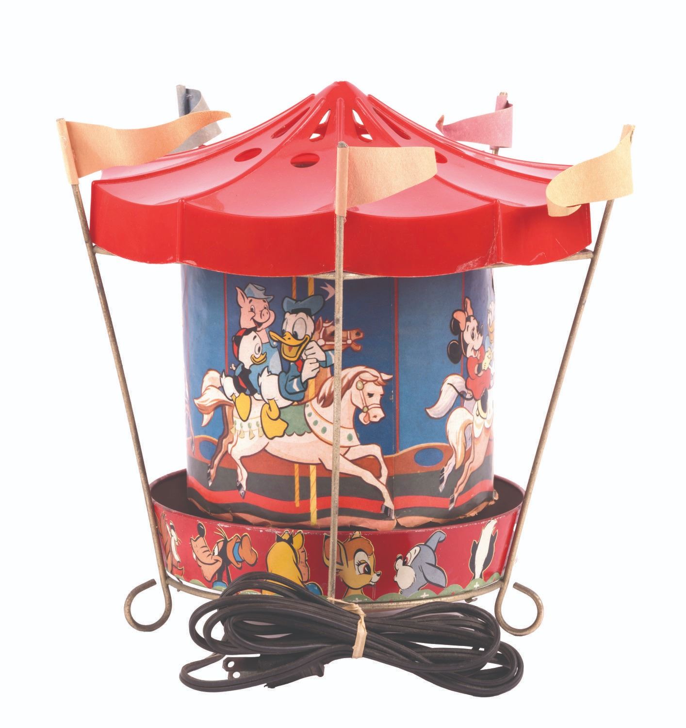 (Econolight, 1950s) An extremely rare Disney Carousel Revolving Motion Lamp by Econolight Corp. The lamp features Disney characters riding merry-go-round horses and was inspired by Fantasyland at Walt Disney’s Disneyland. Measuring 10.25" in diameter and 10” tall, the lamp is in good condition with small hairline cracks to the plastic, color fading, scuffs, scratches, and wear.