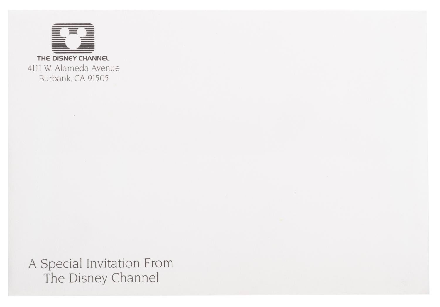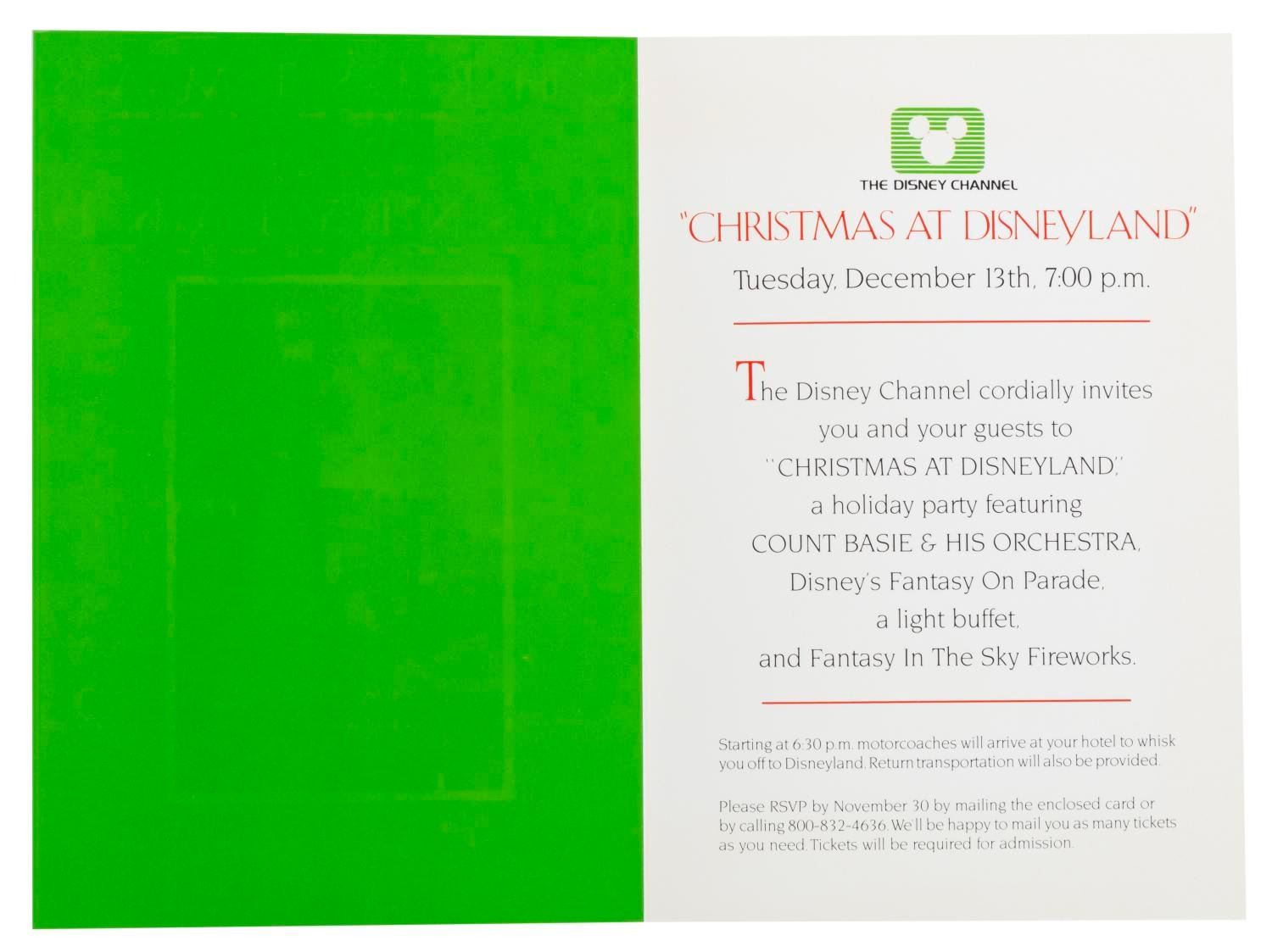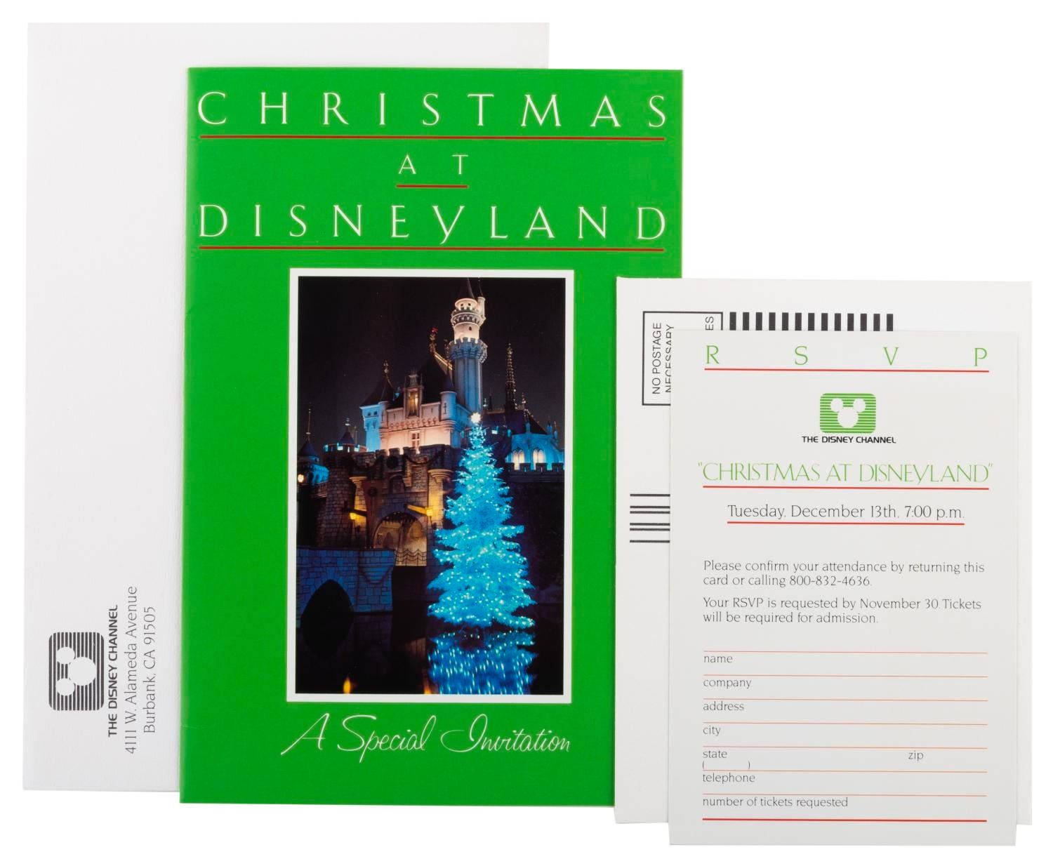 (Disney, 1983) An invitation from The Disney Channel for the Christmas at Disneyland party, held in the Park, featuring Count Basie, Disney's Fantasy on Parade, and Fantasy In The Sky Fireworks. Ranging in size from the 3.75" x 5.5" RSVP card to the 5.5" x 8.25" Disney Channel-branded mailing envelope, the invitation is in very good to fine condition with light handling wear.