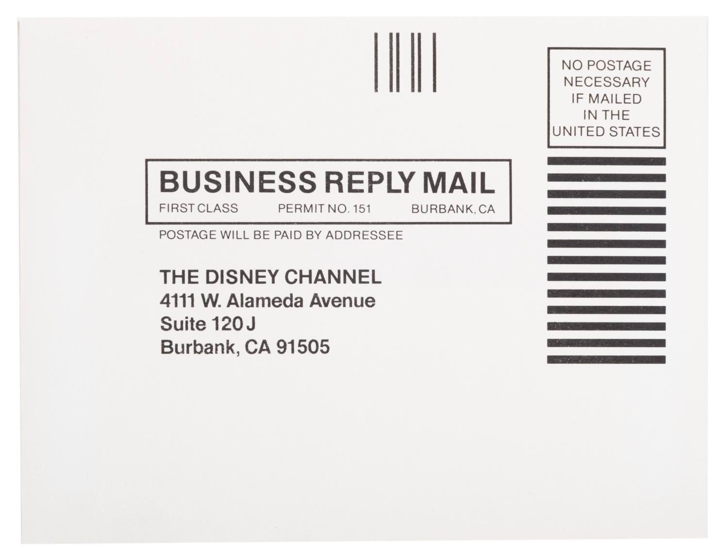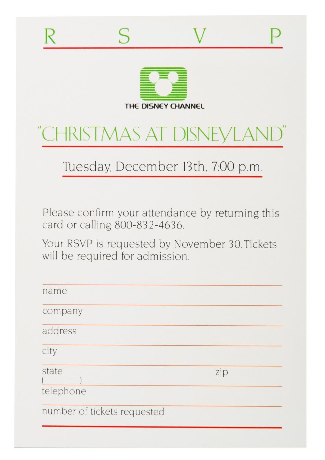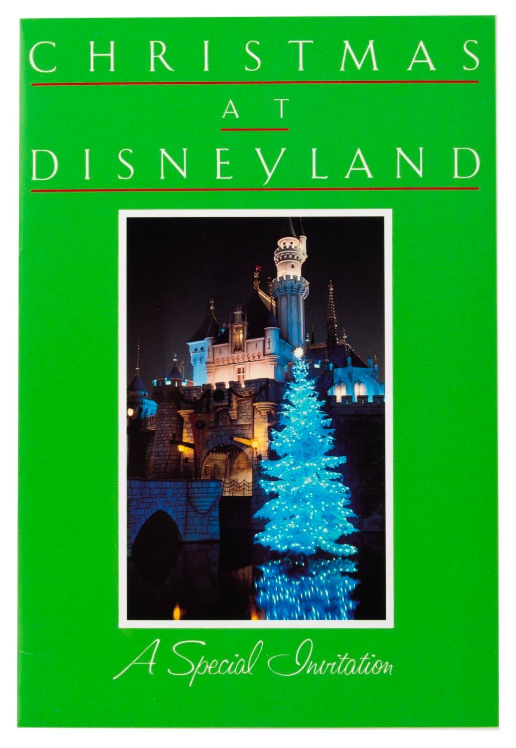 (Disney, 1983) An invitation from The Disney Channel for the Christmas at Disneyland party, held in the Park, featuring Count Basie, Disney's Fantasy on Parade, and Fantasy In The Sky Fireworks. Ranging in size from the 3.75" x 5.5" RSVP card to the 5.5" x 8.25" Disney Channel-branded mailing envelope, the invitation is in very good to fine condition with light handling wear.