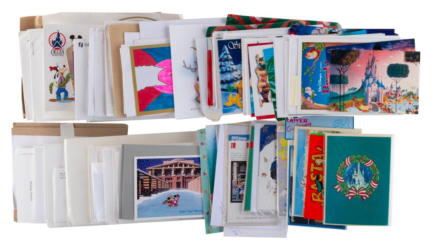 (Disney, 1970s-2000s) A large collection of over 100 Disney Company Christmas Cards. Featuring characters like Mickey, Donald, Bambi, Lady and the Tramp, and Chip ‘n Dale, these cards came from various Disney offices and departments around the world including France, China, Spain, Mexico, Tokyo, Italy, and Denmark. Ranging in size up to 6” x 8.75, the cards are in very good to fine condition with some inscribed in ink.