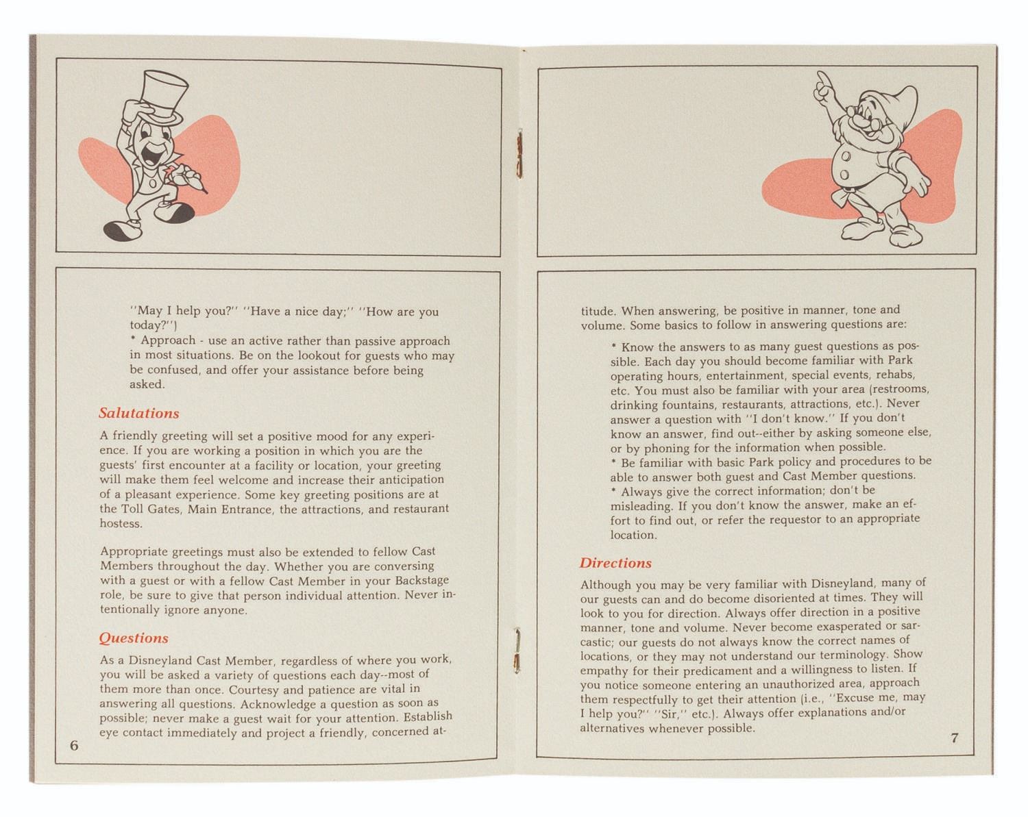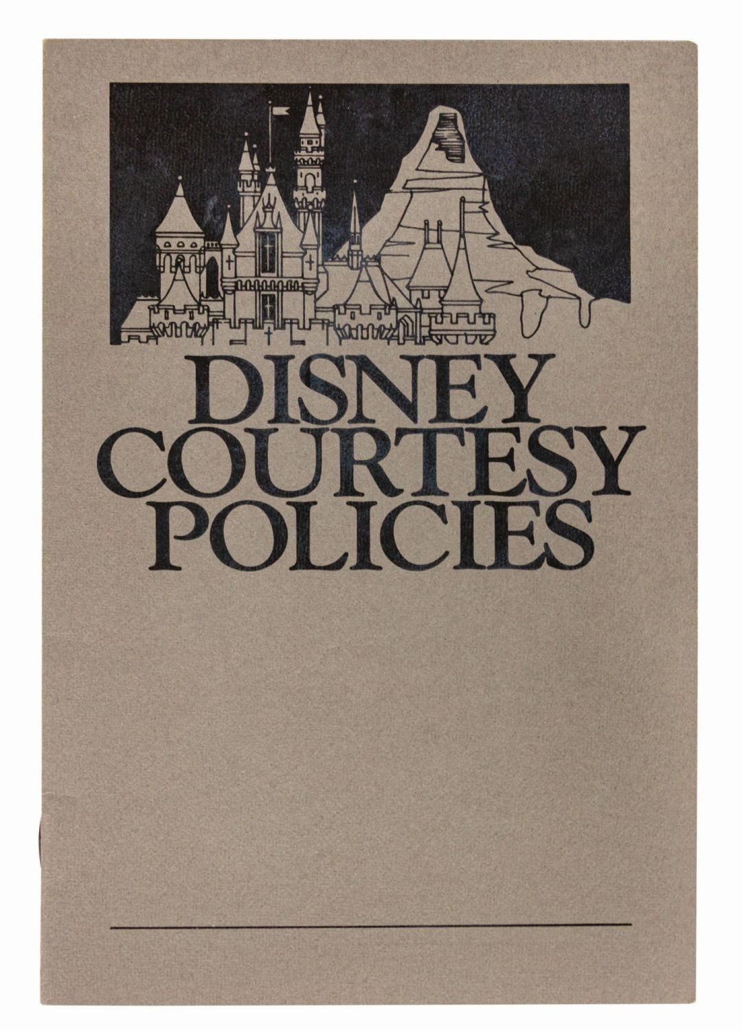 (Disneyland, 1984) A Disney Courtesy Policies book prepared for Disneyland Cast Members by Disney University. The 16-page guide ensures the achievement of outstanding guest service through the practice of specific policies, tools, and techniques. Measuring 5.5" x 8.5”, the book is in fine condition.