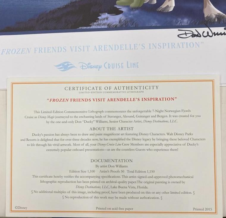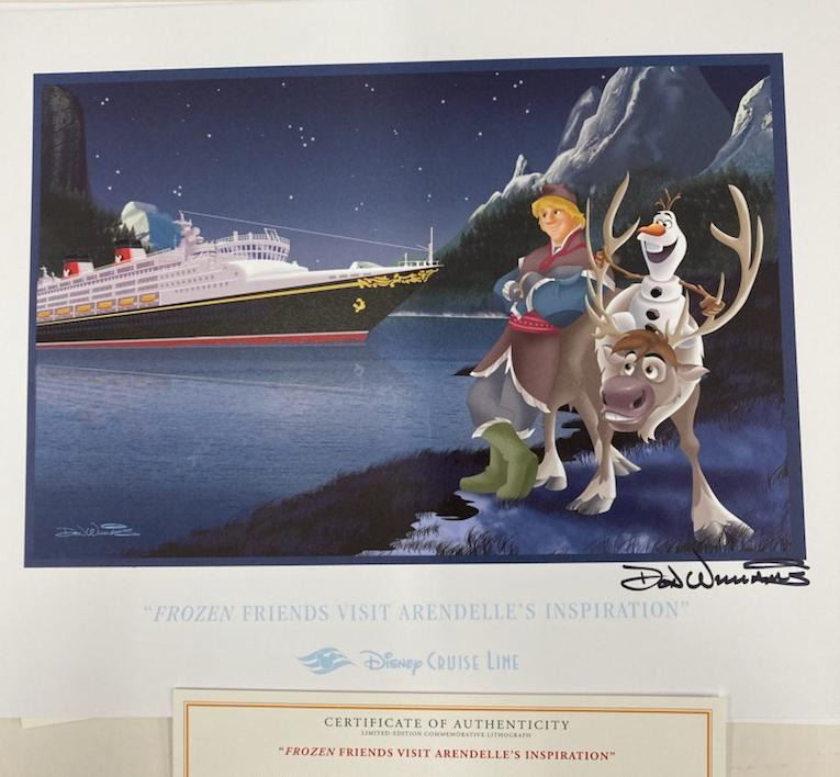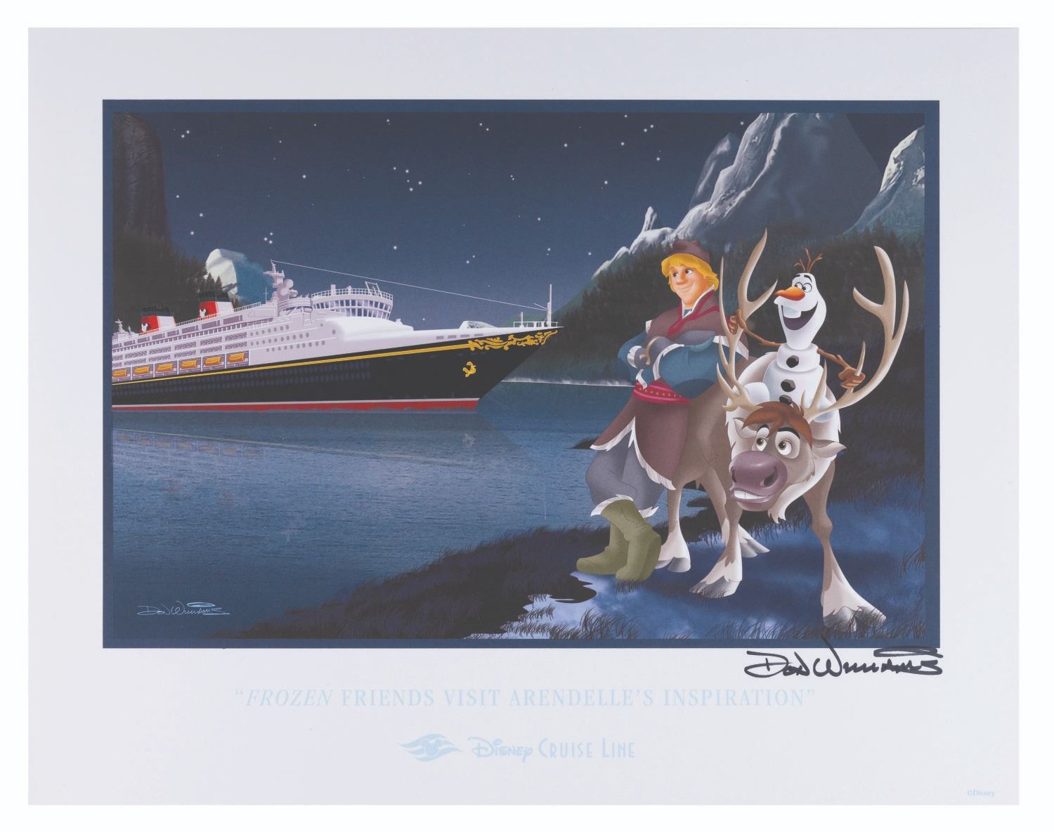 (Disney, 2015) A lithograph of the Disney Magic Cruise Ship with Olaf, Sven, and Kristoff from "Frozen." Titled "Frozen Friends Visit Arendelle's Inspiration," the piece commemorates the ship's 7-night Norwegian Fjords cruise. Released in a limited edition of 1,100 plus 50 Artist’s Proofs, the lithograph is signed by the artist, Don Williams. With an image size of 8" x 12" on 11" x 14" paper, the art is in fine condition.