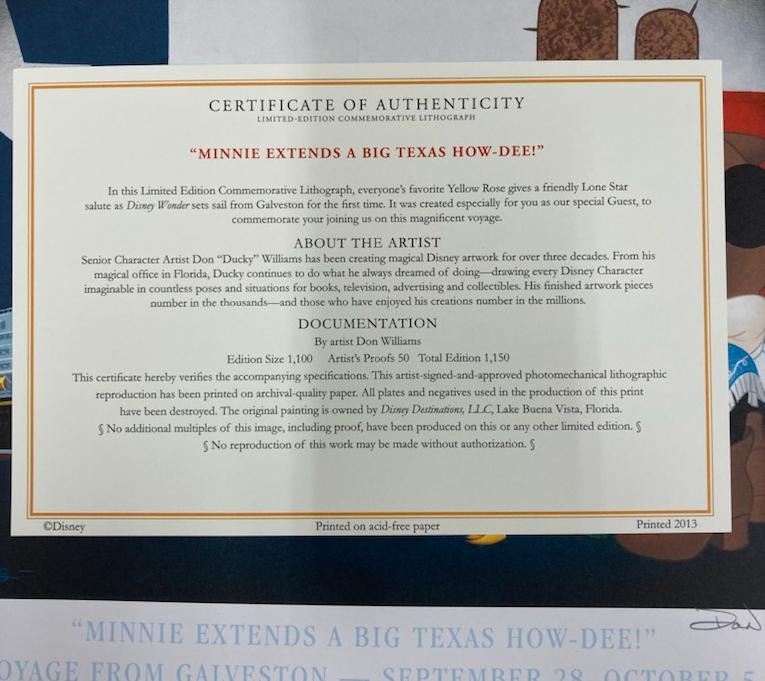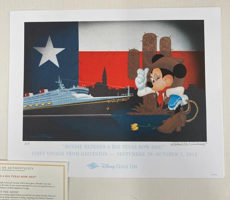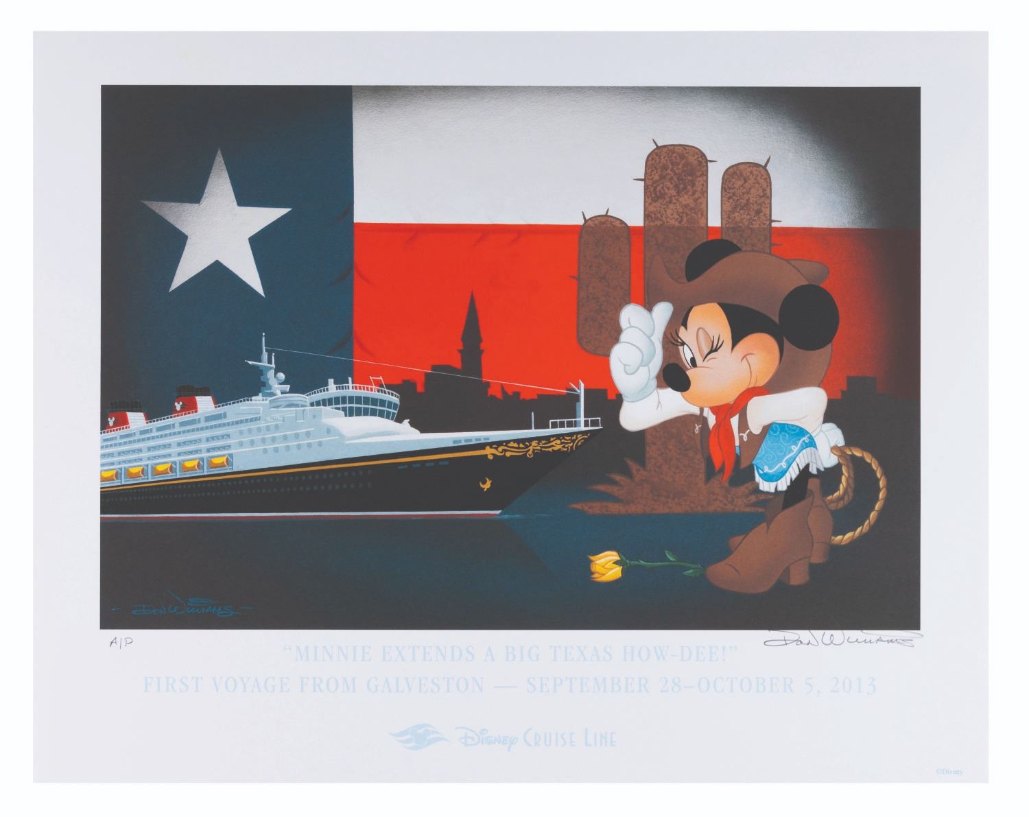 (Disney, 2010) A lithograph of the Disney Wonder Cruise Ship with Minnie Mouse. Titled "Minnie Extends a Big Texas How-Dee!" the piece commemorates the ship's first voyage to Galveston, Texas. Released in a limited edition of 1,100 plus 50 Artist’s Proofs, the lithograph is signed in pencil by the artist, Don Williams, and marked "AP." With an image size of 8" x 12" on 11" x 14" paper, the art is in fine condition.