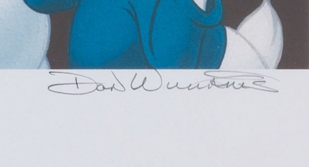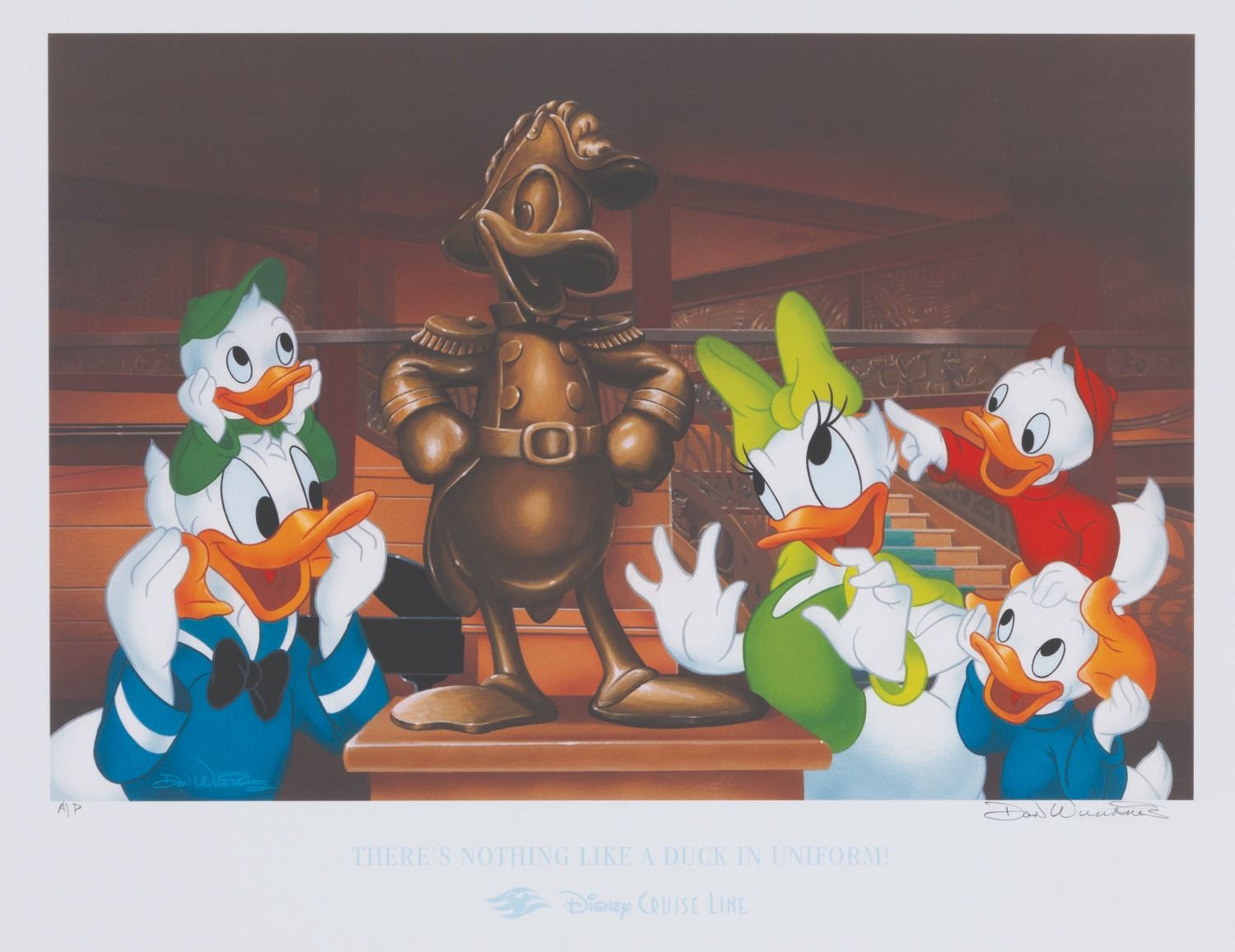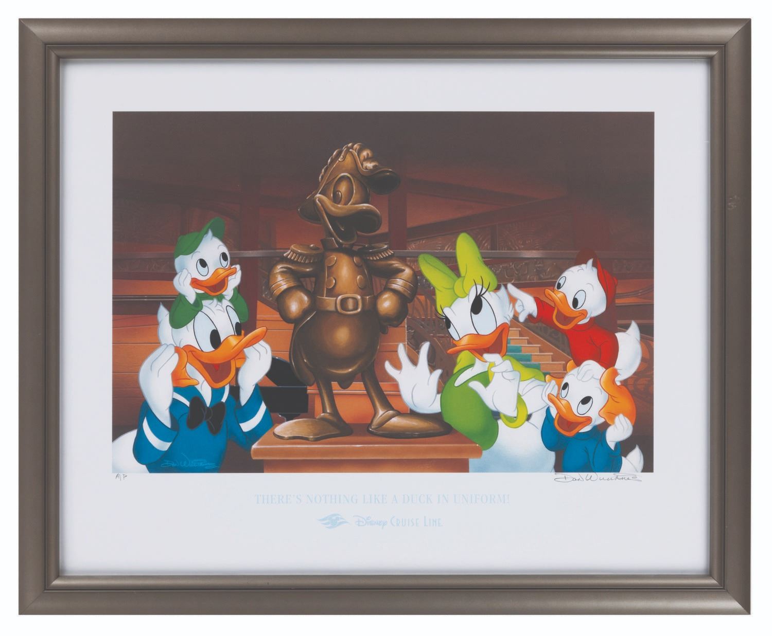 (Disney, 2010) A lithograph of Donald Duck, Daisy, and the nephews admiring a statue of Donald in the atrium lobby of the Disney Dream cruise ship. Titled "There's Nothing Like a Duck in Uniform," the piece was created to commemorate the ship's maiden voyage in January 2011. Released in a limited edition of only 1,500 plus 50 Artist’s Proofs, this lithograph was signed by the artist Don Williams and marked "AP." With an image size of 11" x 16" on 16" x 20" paper, the art is in fine condition.