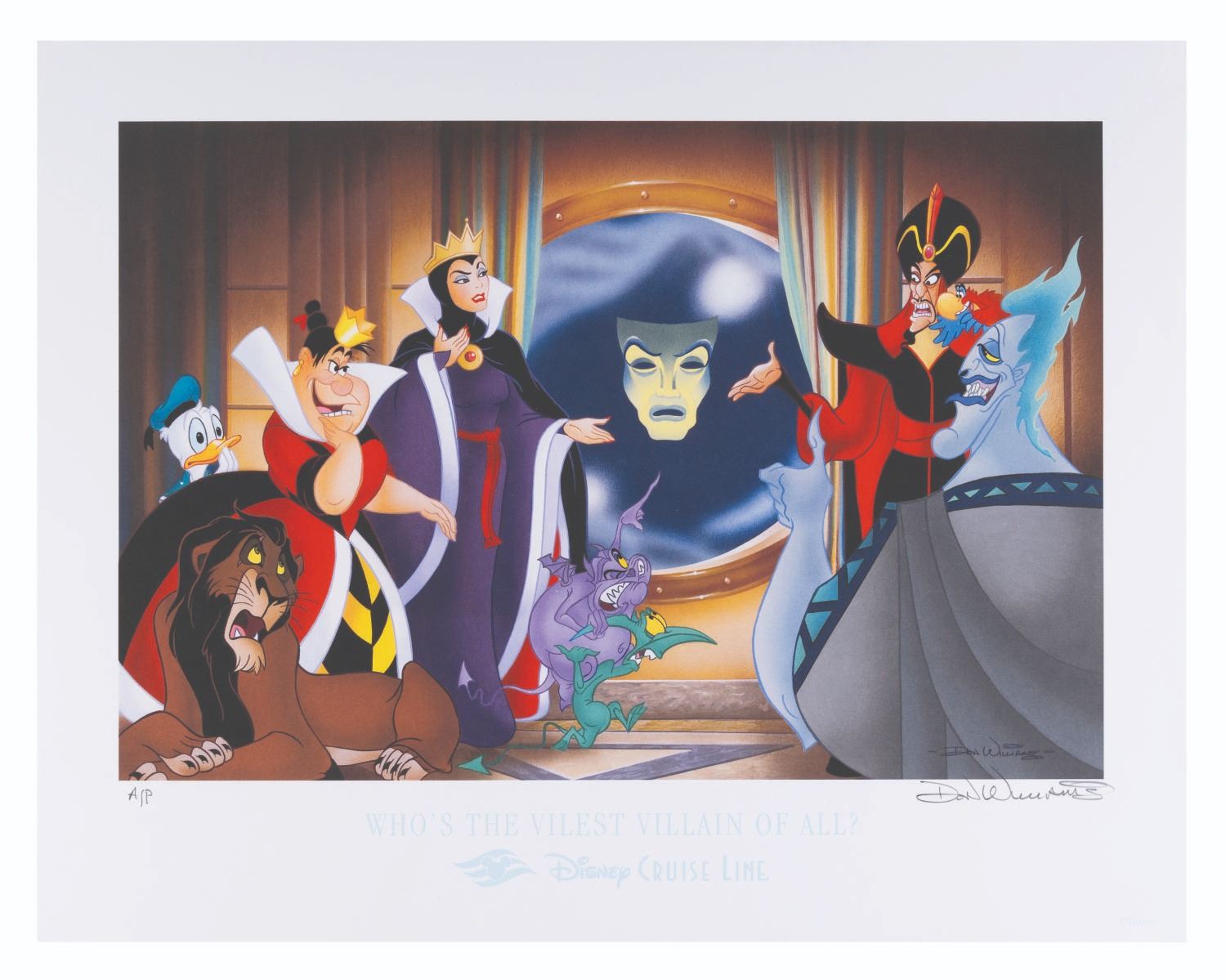 (Disney, 2010) A lithograph of Disney villains aboard the Disney Magic Cruise Ship. Titled "Who’s the Vilest Villain of Them All," the piece commemorates the Magic’s 2010 Cruise to Spain and Portugal. Released in a limited edition of 1,100 plus 50 Artist’s Proofs, this lithograph is signed by the artist Don Williams and marked "AP." With an image size of 8" x 12" on 11" x 14" paper the art is in fine condition.