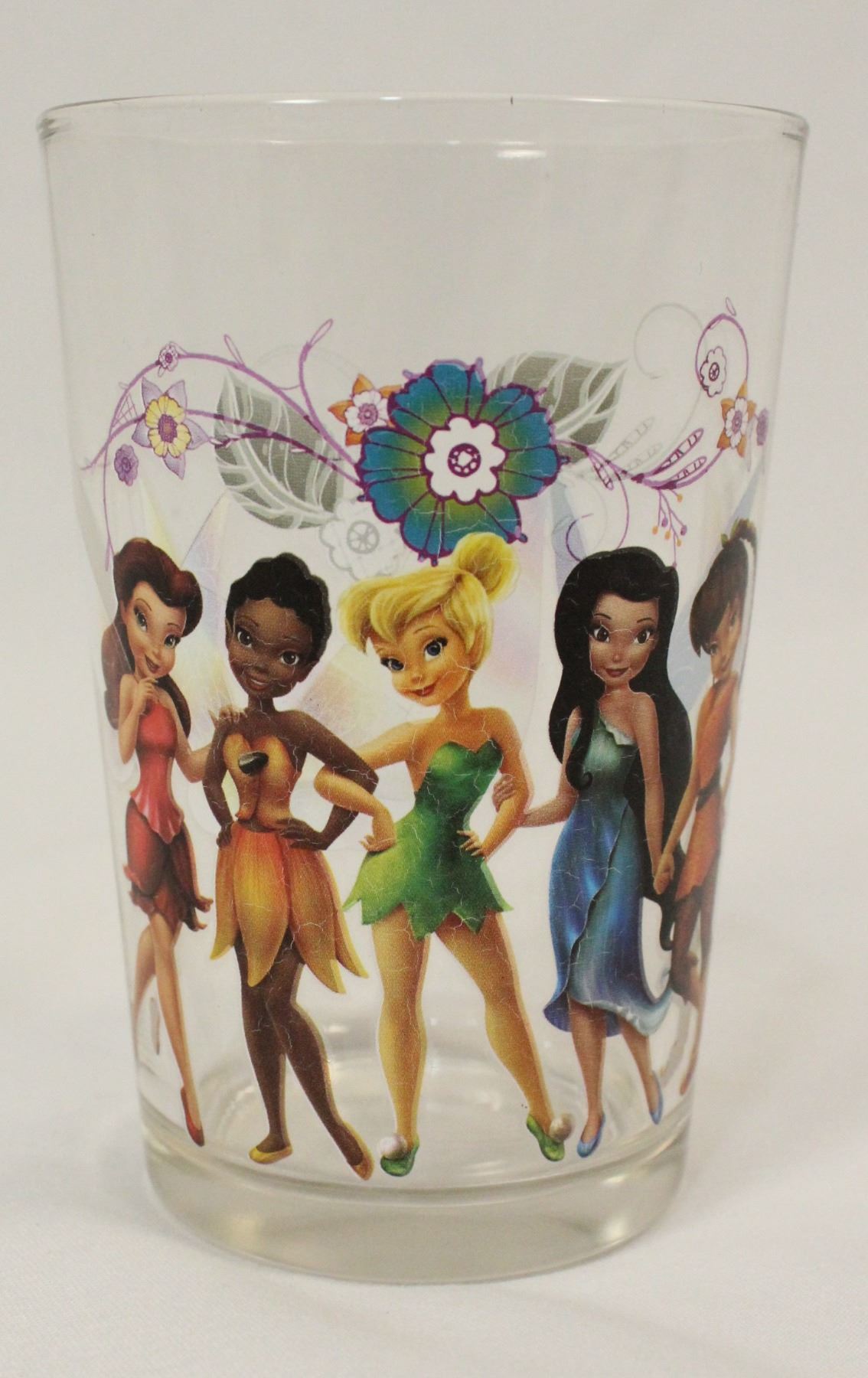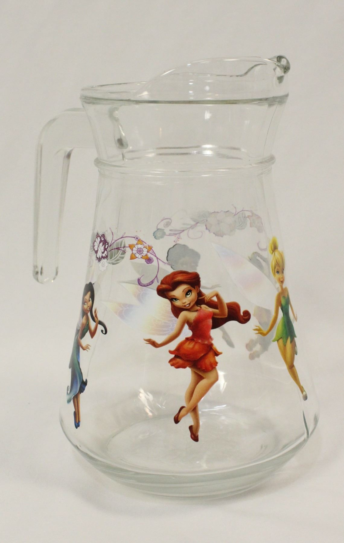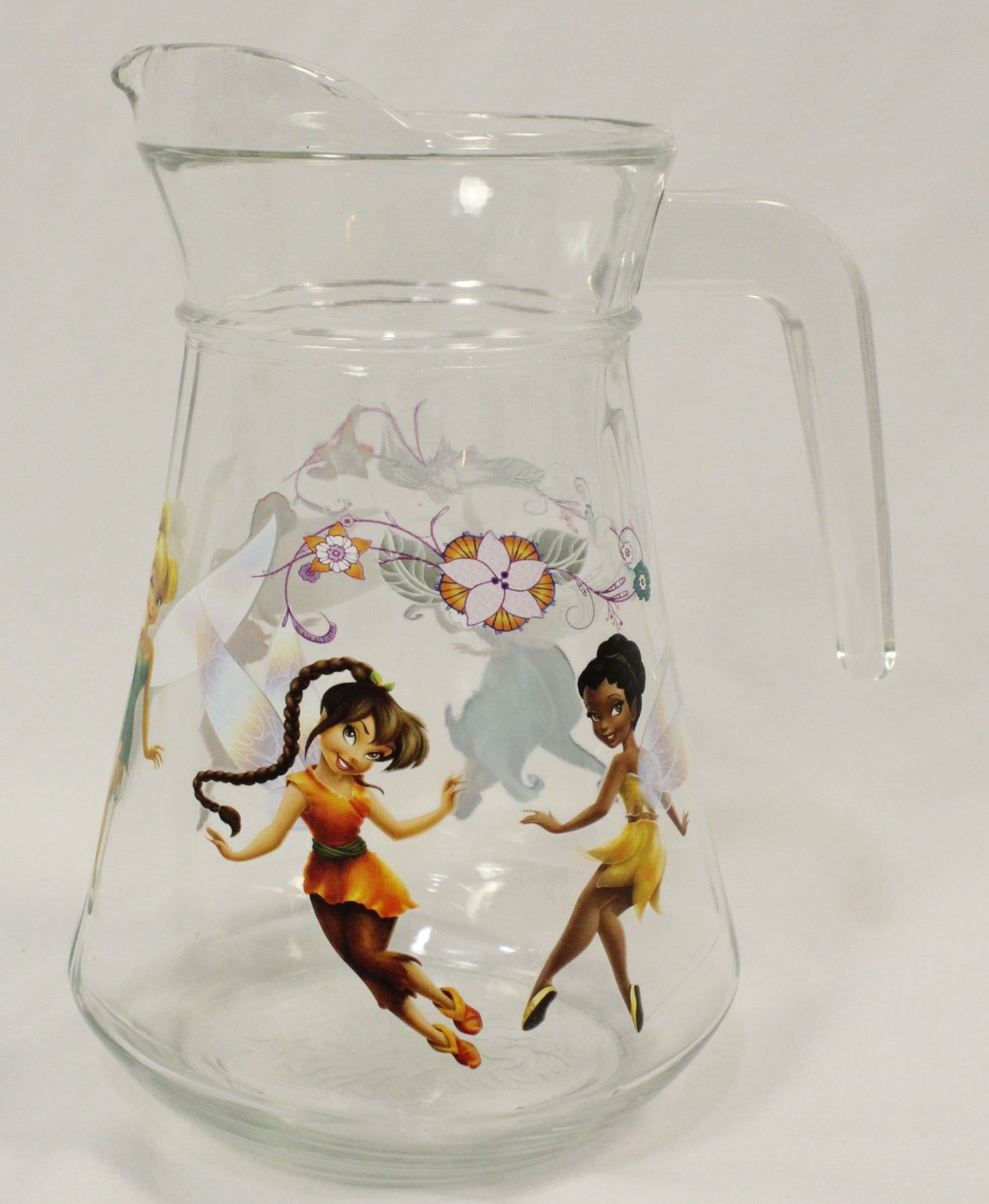 This is a five piece pitcher set that has never been used. It is features characters from the animated films featuring Disney Fairies Tinker Bell, Rosetta, Silvermist, Fawn and Iidessa. The pitcher holds 46 oz. and the glasses hold 7 oz.