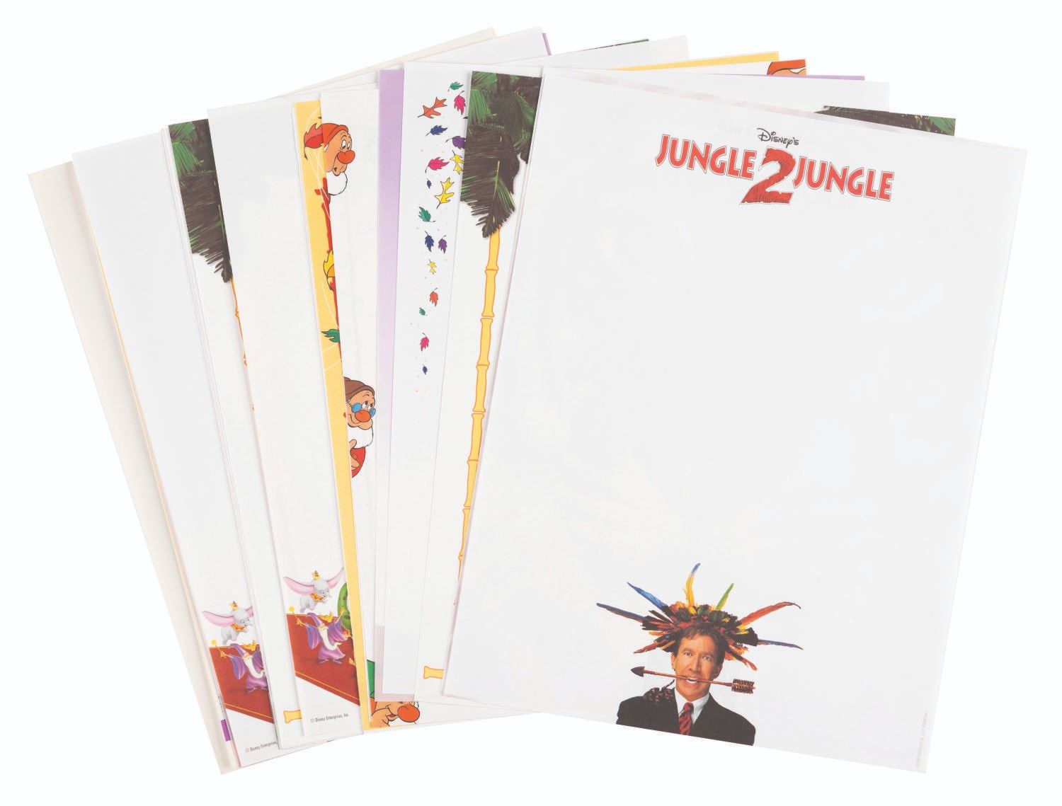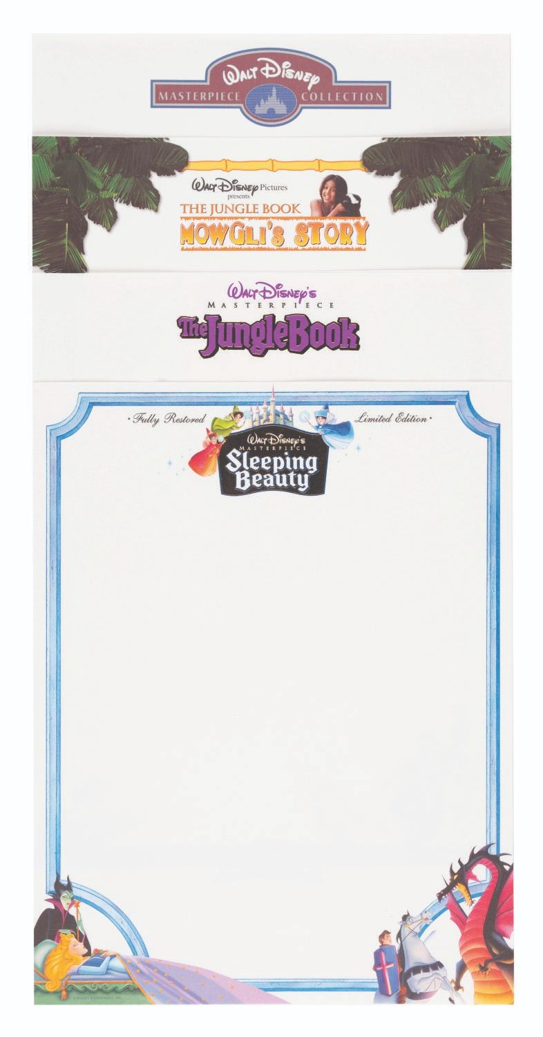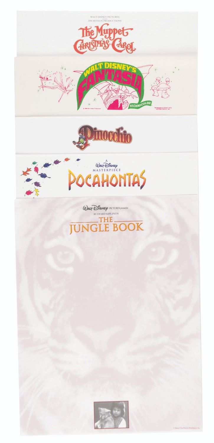 (Disney, 1980s-90s) A collection of twenty-six sheets of Disney film letterhead stationery. Included are letterheads from "The Muppet Christmas Carol," "Fantasia," "Pinocchio," "The Lion King," "Pocahontas," "Snow White and the Seven Dwarfs," "Jungle 2 Jungle," "Aladdin," "Masterpiece Collection," "The Jungle Book," "The Jungle Book: Mowgli's Story," and "Sleeping Beauty." Measuring 11" x 8.5" each, the stationery is in very good condition with minor edge wear.