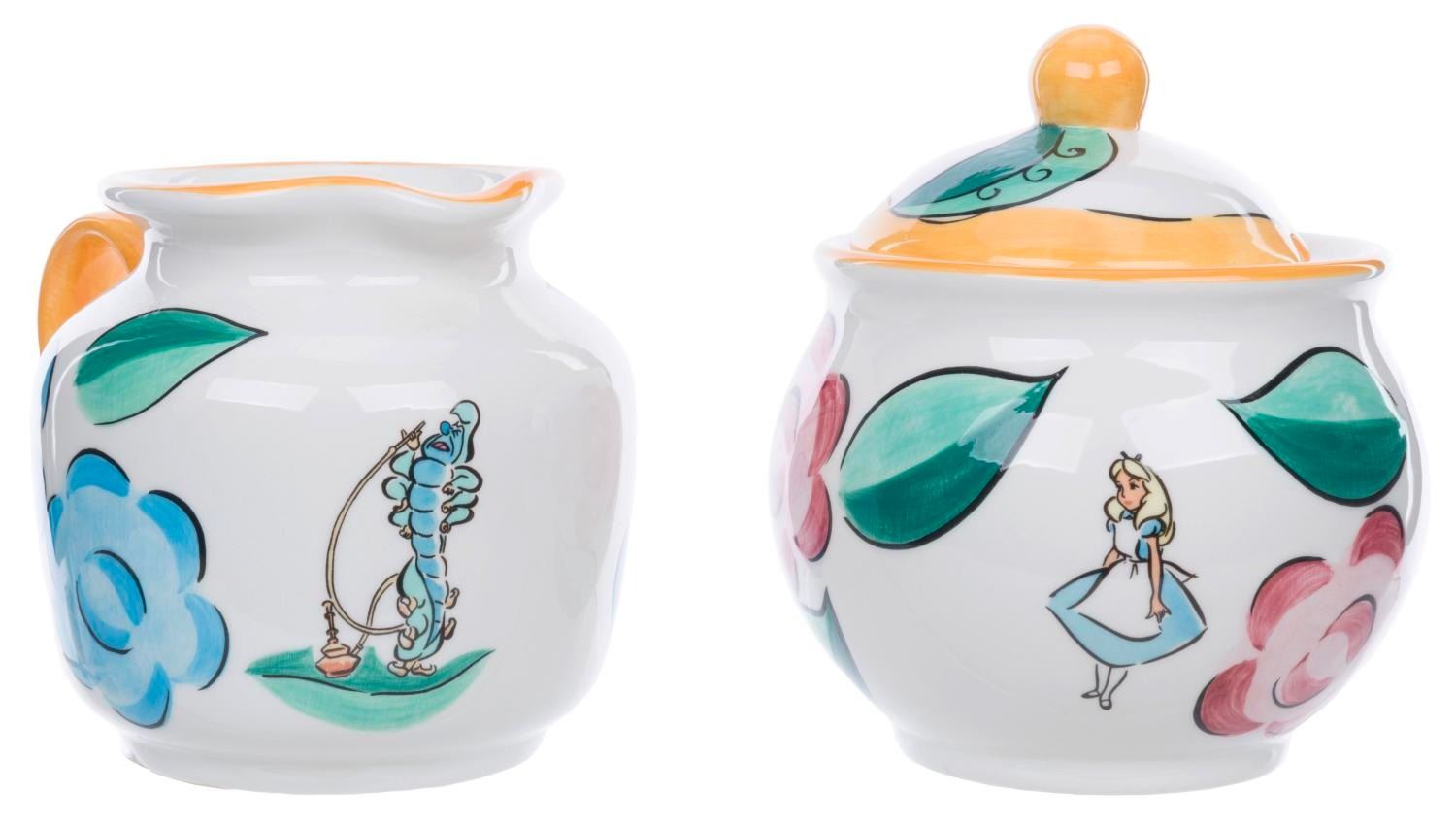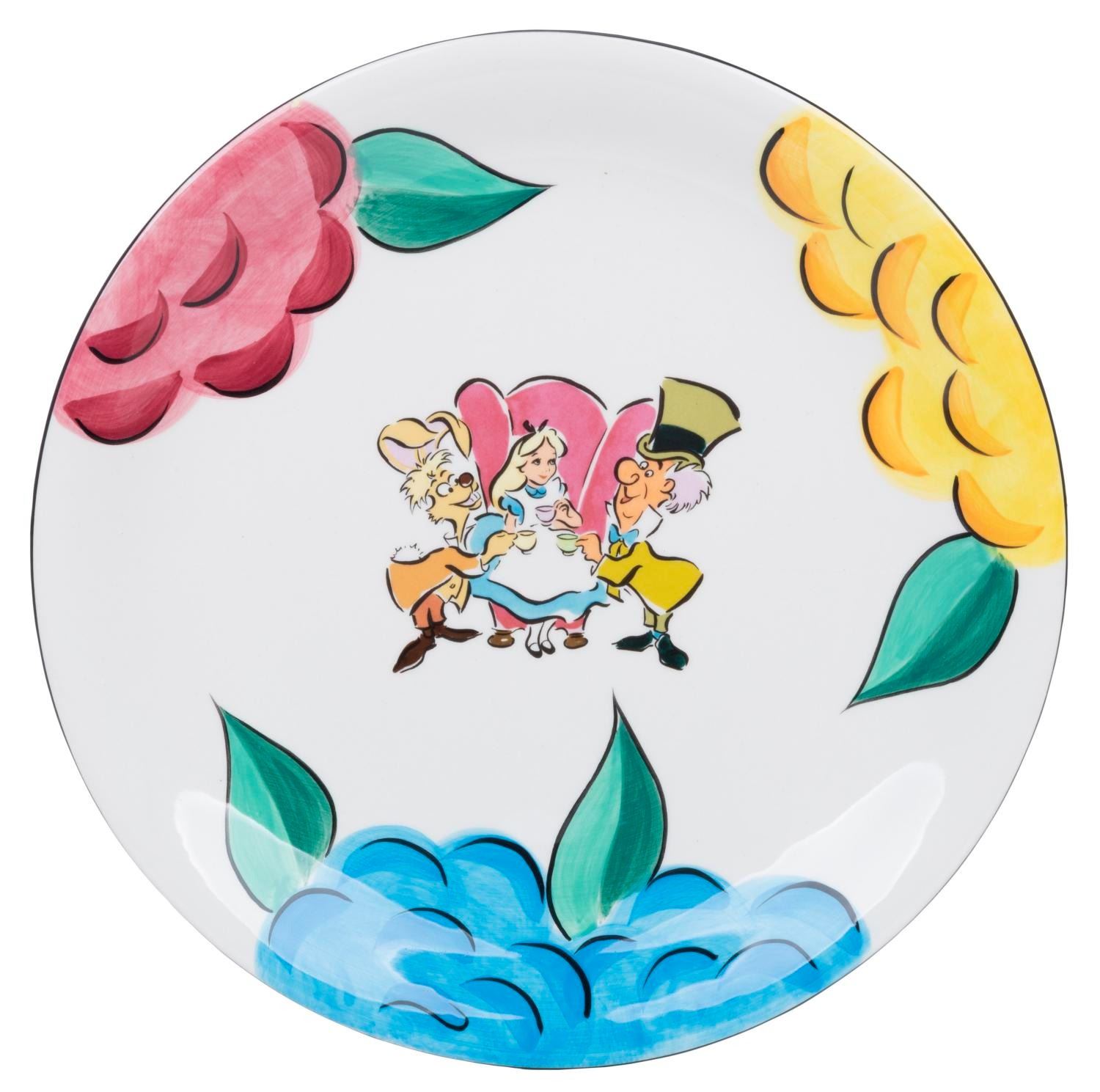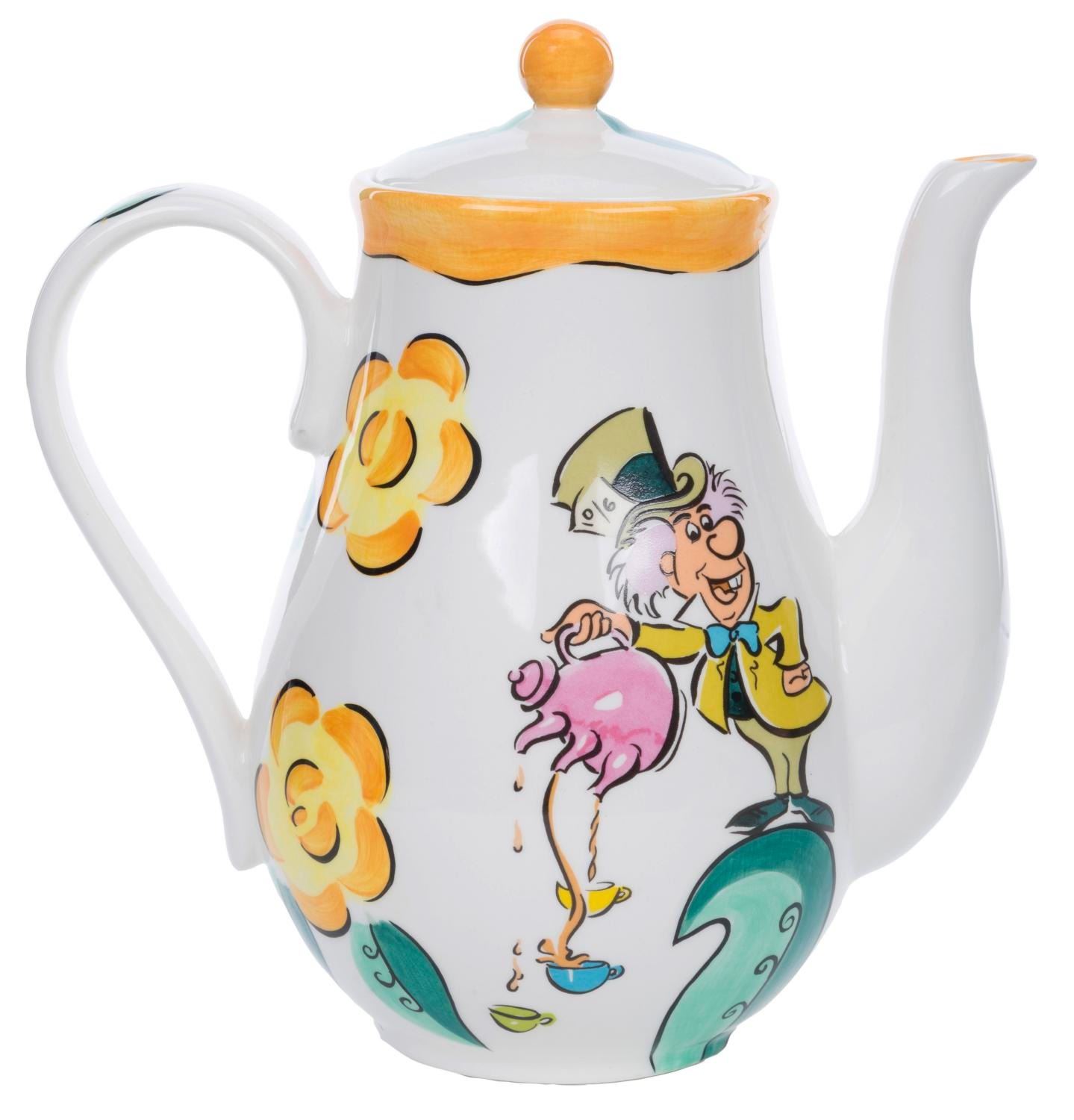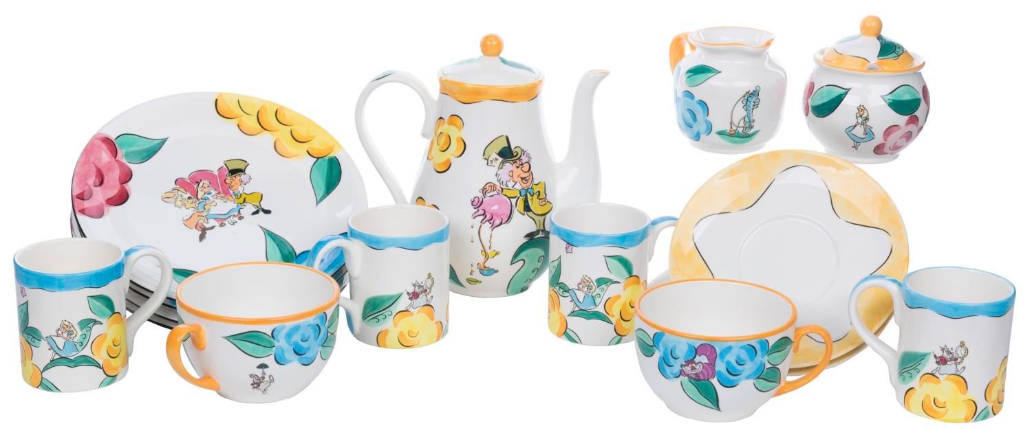 (Disney, 1990s) A set of tableware from the "Alice in Wonderland Collection" sold at the Walt Disney Gallery. This vibrant set includes one teapot, one creamer, one sugar bowl, four mugs, four plates, two cappuccino cups, and two cappuccino plates. Measuring 3.25" in diameter and 4" tall to 5" x 9" and 9.5" tall, the set is in fine to very good condition with very light crazing on a few pieces, most notably one of the plates and the teapot.