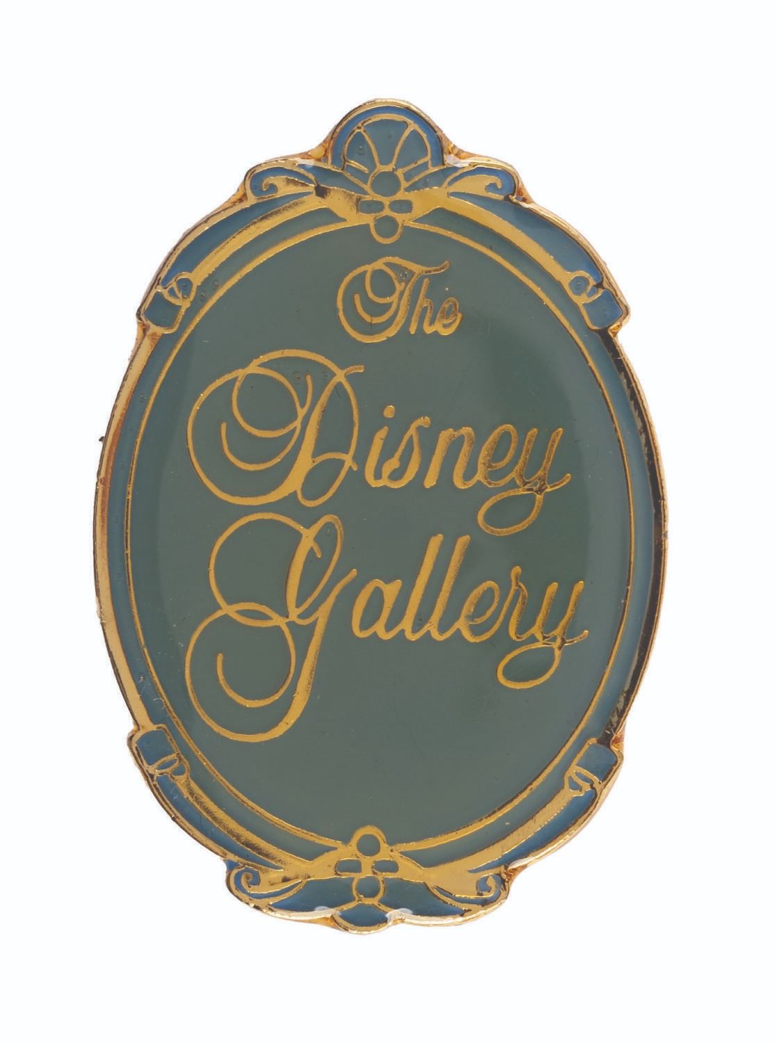 (Disneyland, 1990s) A souvenir pin of the Disney Gallery logo in delicate gold and teal. Measuring 1.25" x .75", the pin is in fine condition.