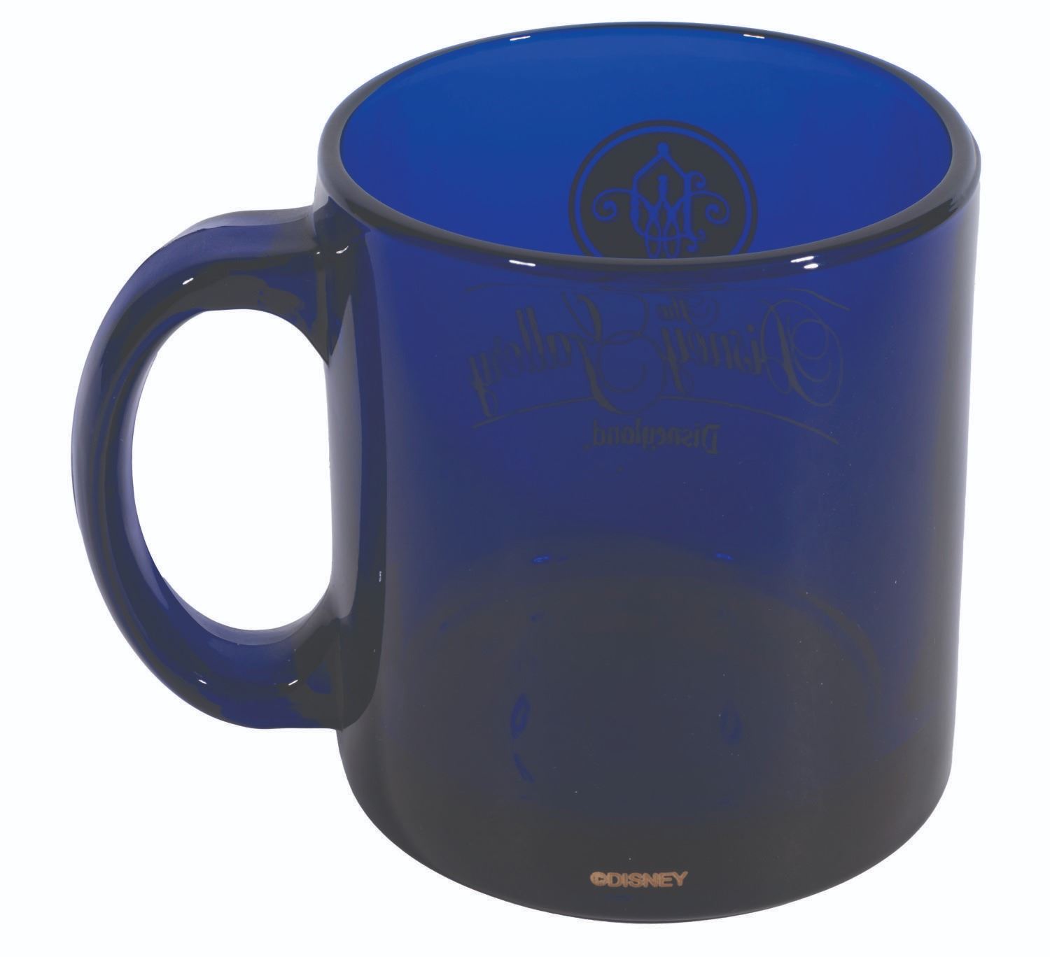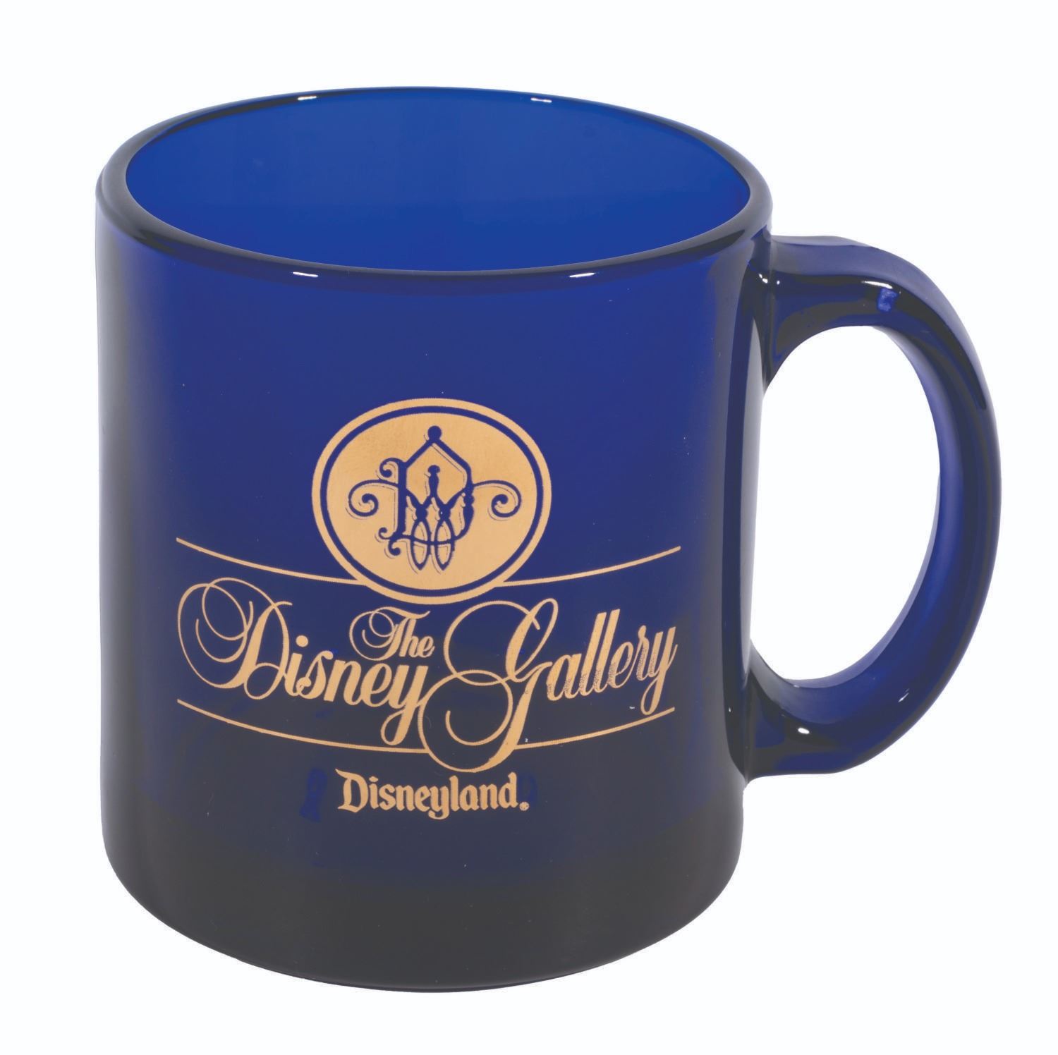 (Disneyland, 1990s-2000s) A souvenir glass coffee mug from the Disney Gallery in New Orleans Square, featuring the logo detailed in a delicate gold. Measuring 3.75" tall and 3.5" in diameter, the mug is in very good condition with light surface wear and scratches on the bottom of the base.